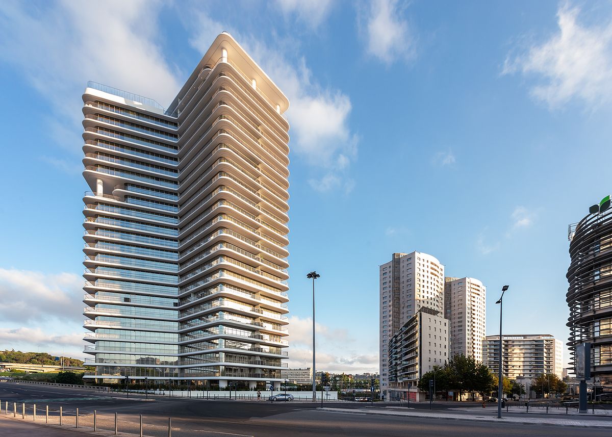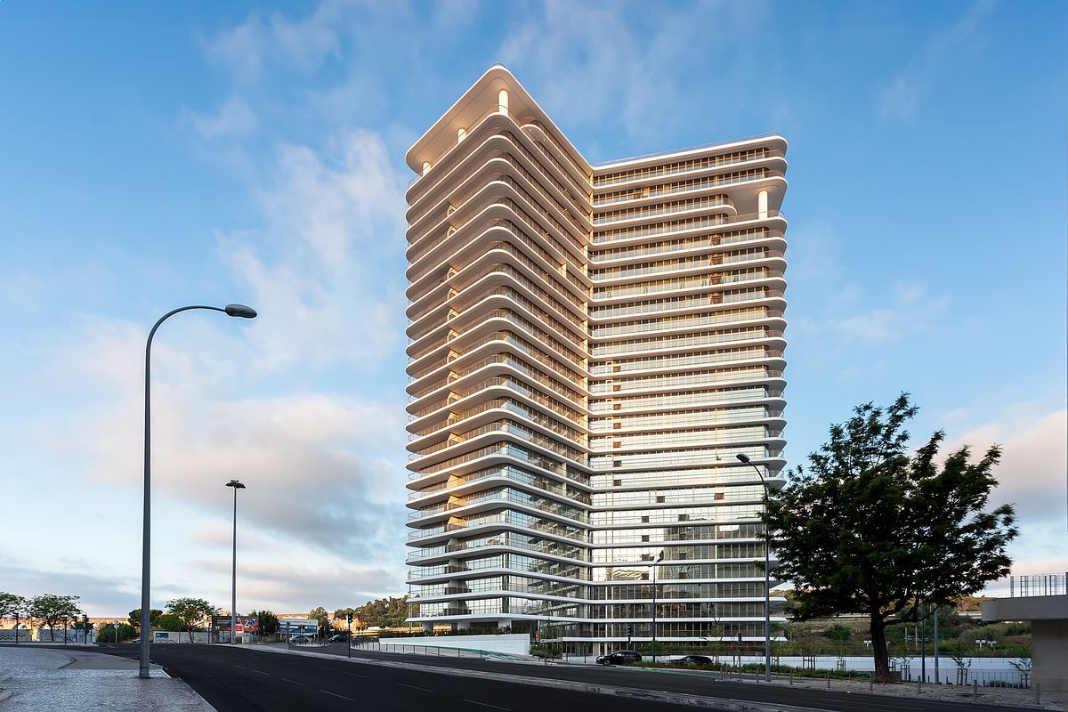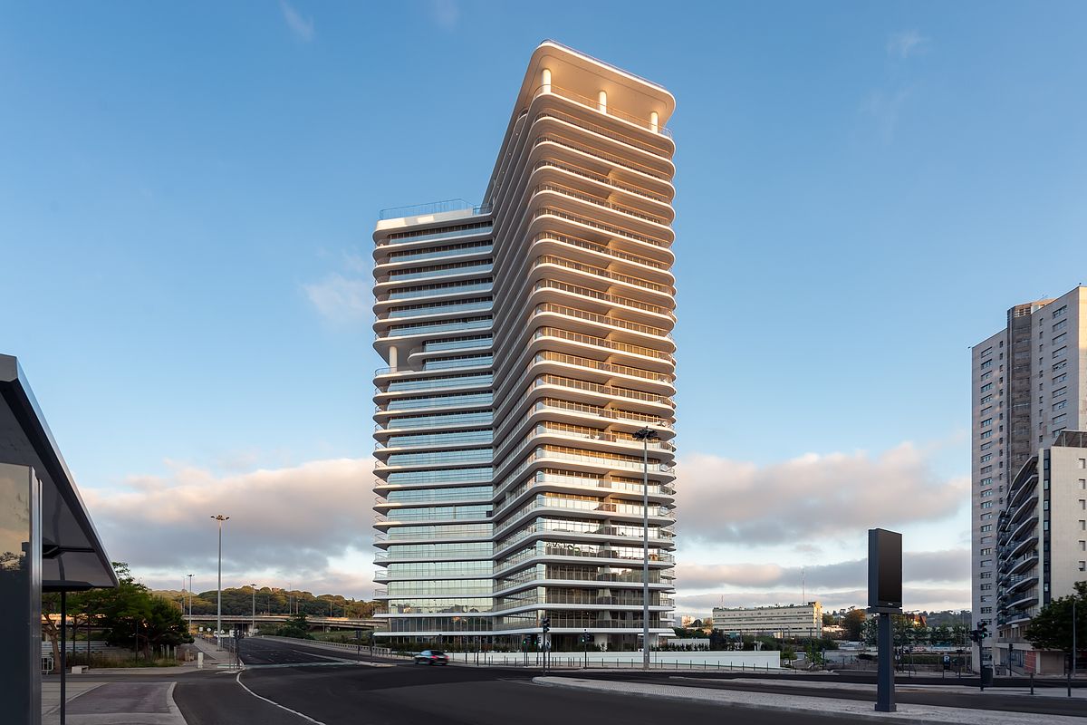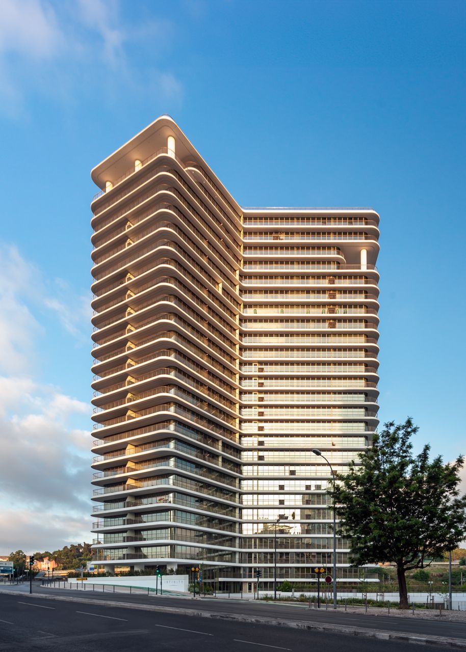 Cada ala possui uma organização tipológica própria, que resulta da hierarquização do sistema de vistas e exposição solar. De linhas modernas e elegantes, a altura é modelada com arte e engenho pelo desenho liberto de arestas vivas, adoçando o imenso corpo ao horizonte, enfatizando-lhe a verticalidade. A imagem final resulta fluida e de uma simplicidade quase paradoxal. Alguns terraços ajardinados pontuam a torre, humanizando-a. O projeto privilegia uma forma de habitar de excelência, sem concessões. in Saraiva+Associados