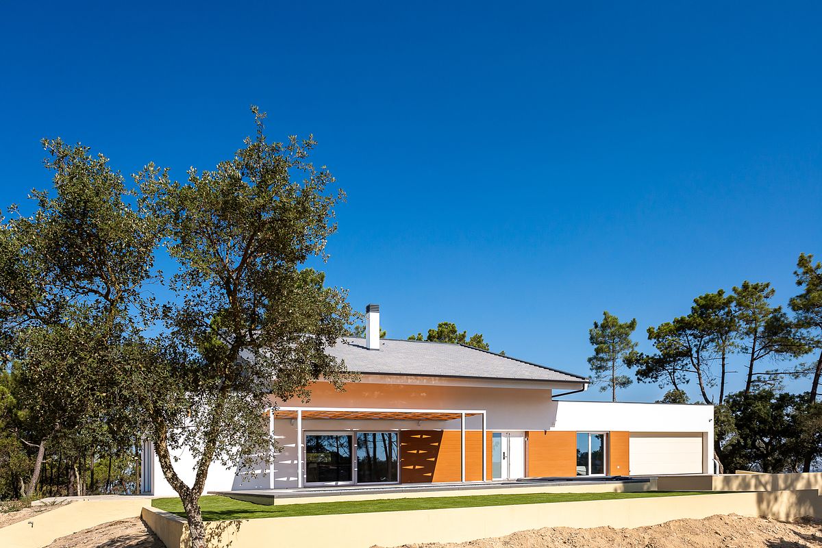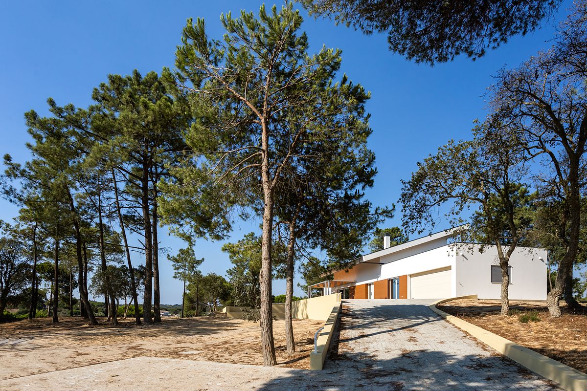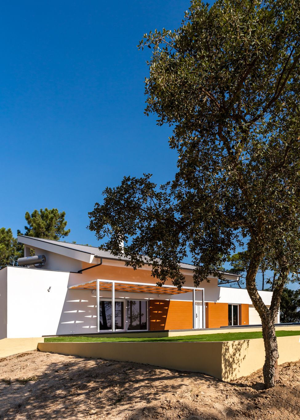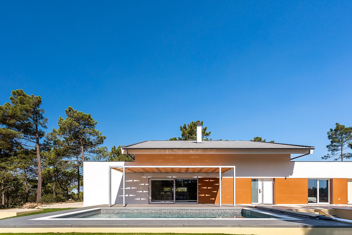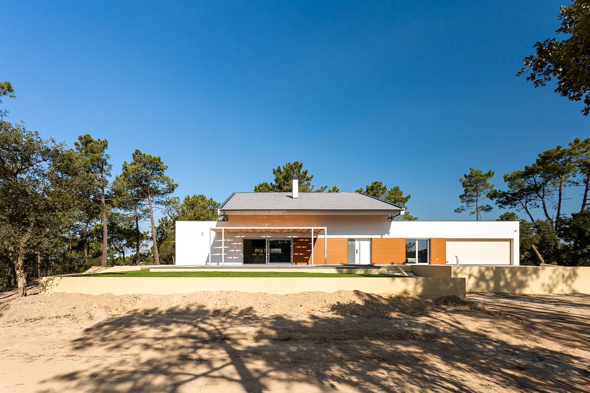 A Fachada Frontal, destaca-se a zona de entrada protegida ainda pela Cobertura, permitindo abrigo de chuvas na entrada, bem como a alpendre e piscina que se prolongam ao longo desde alçado. A garagem encontra-se também neste alçado sendo a primeira entrada precedente de uma caminho directo desde o portão da propriedade. O lote, de grande dimensões, dá lugar a um rodeado de de pinheiros e alguns sobreiros da propriedade servindo não só de privacidade como de proteção a intemperies e ventos fortes.
