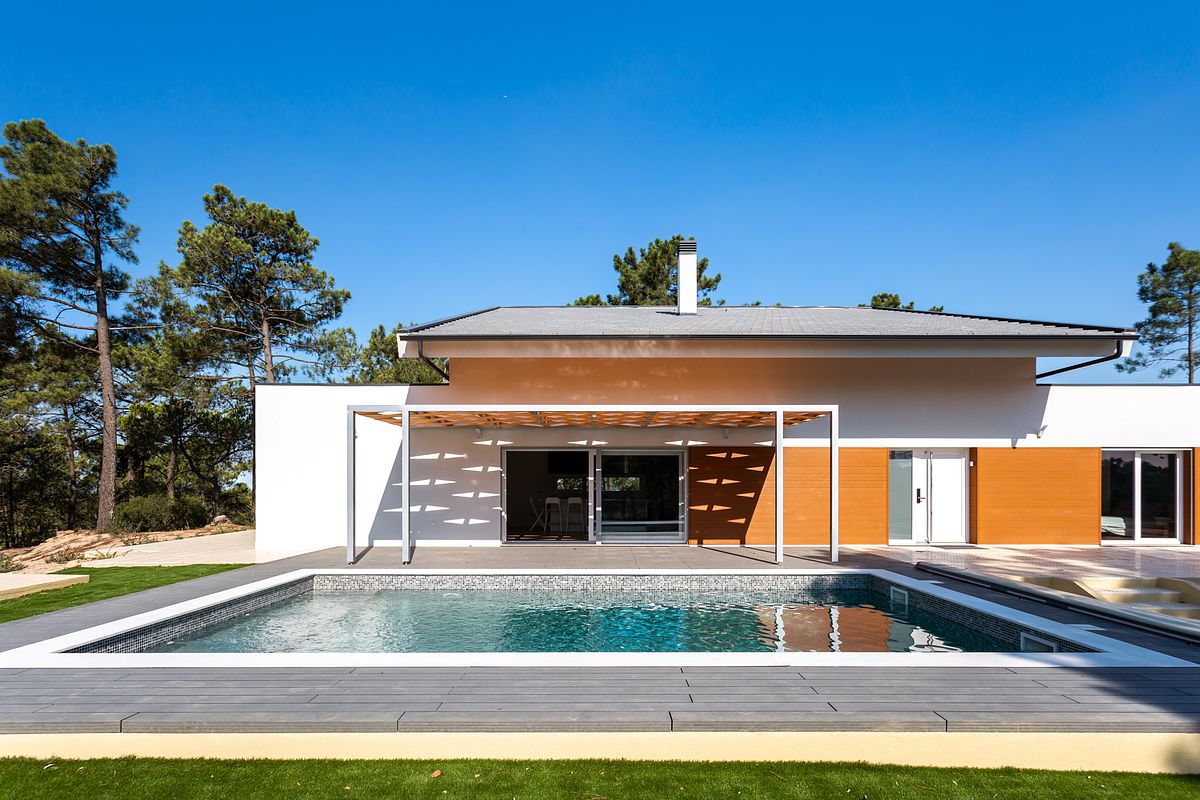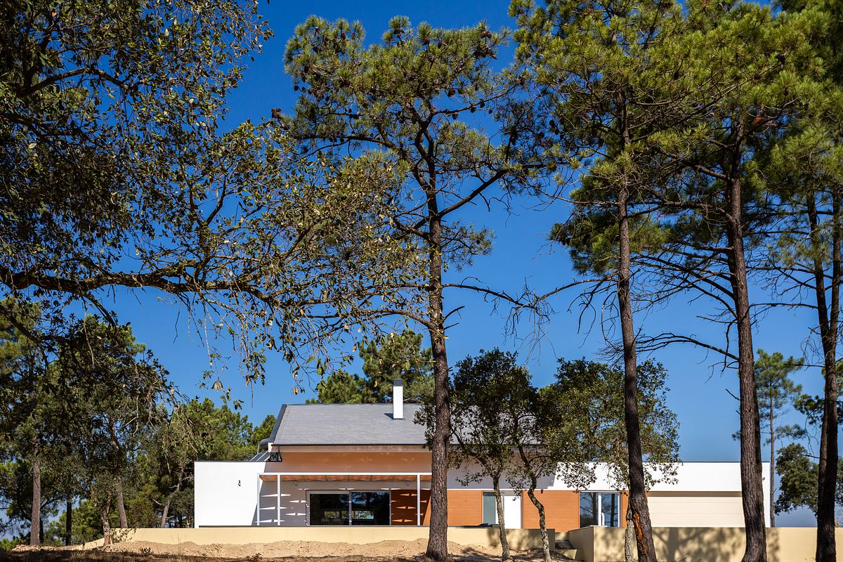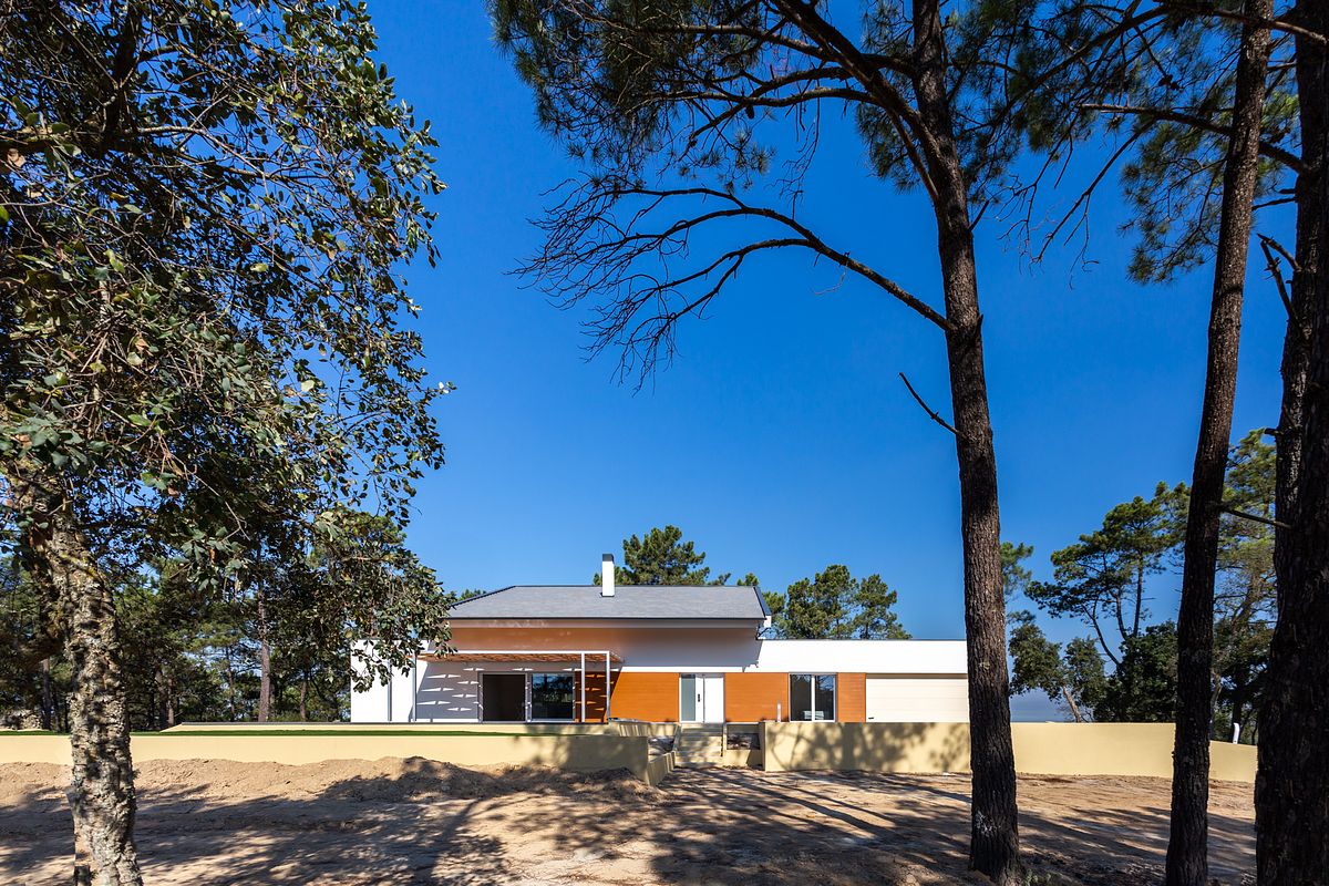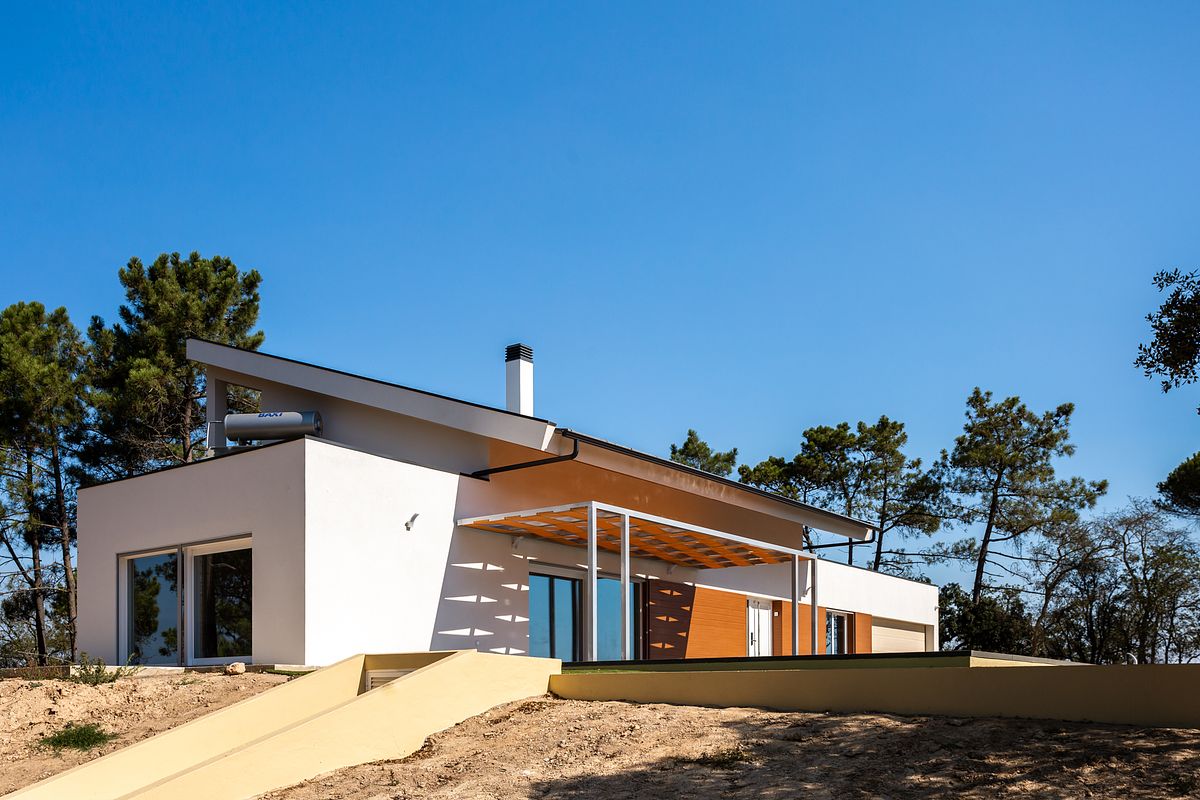 A Fachada Frontal, destaca-se a zona de entrada protegida ainda pela Cobertura, permitindo abrigo de chuvas na entrada, bem como a alpendre e piscina que se prolongam ao longo desde alçado. A garagem encontra-se também neste alçado sendo a primeira entrada precedente de uma caminho directo desde o portão da propriedade. O lote, de grande dimensões, dá lugar a um rodeado de de pinheiros e alguns sobreiros da propriedade servindo não só de privacidade como de proteção a intemperies e ventos fortes.