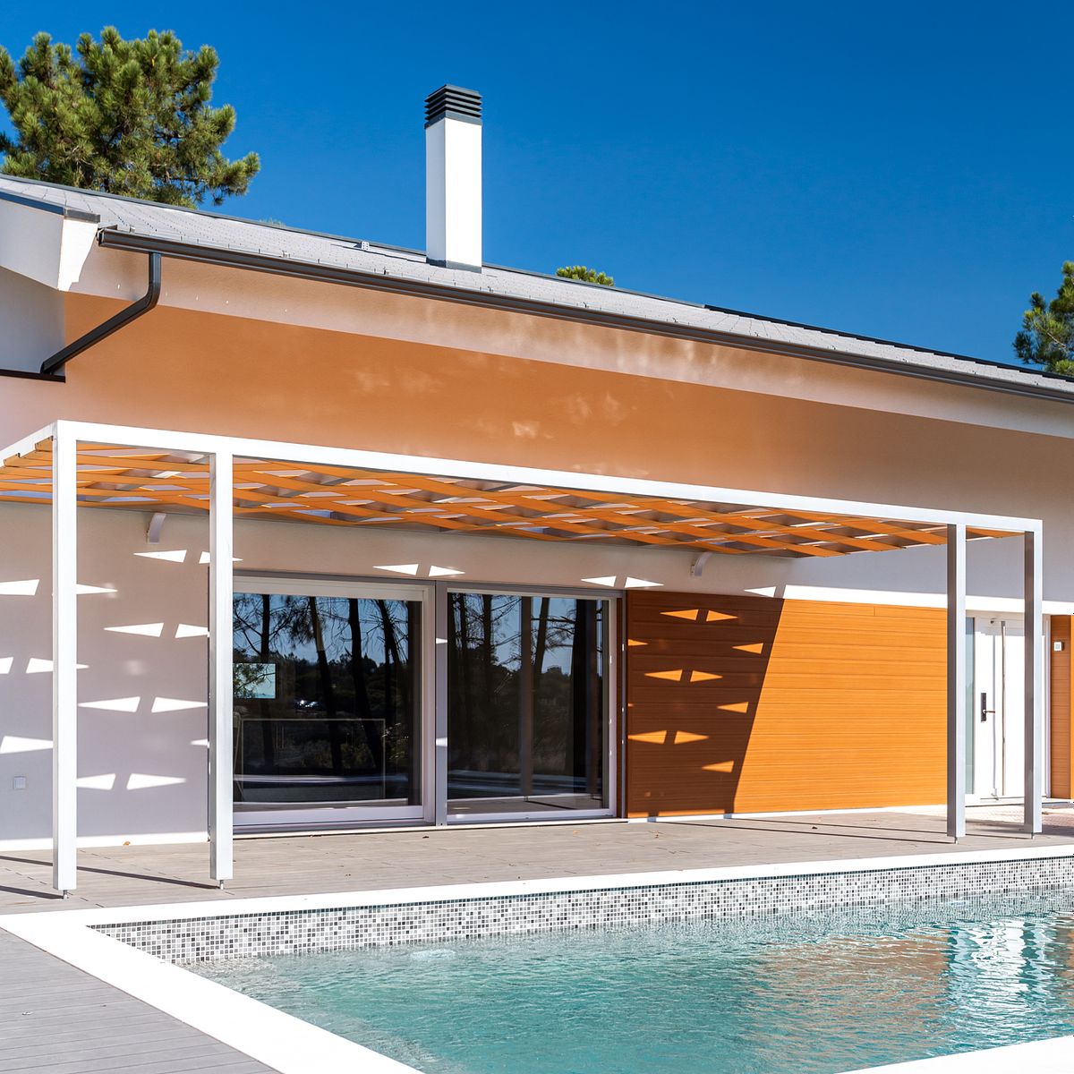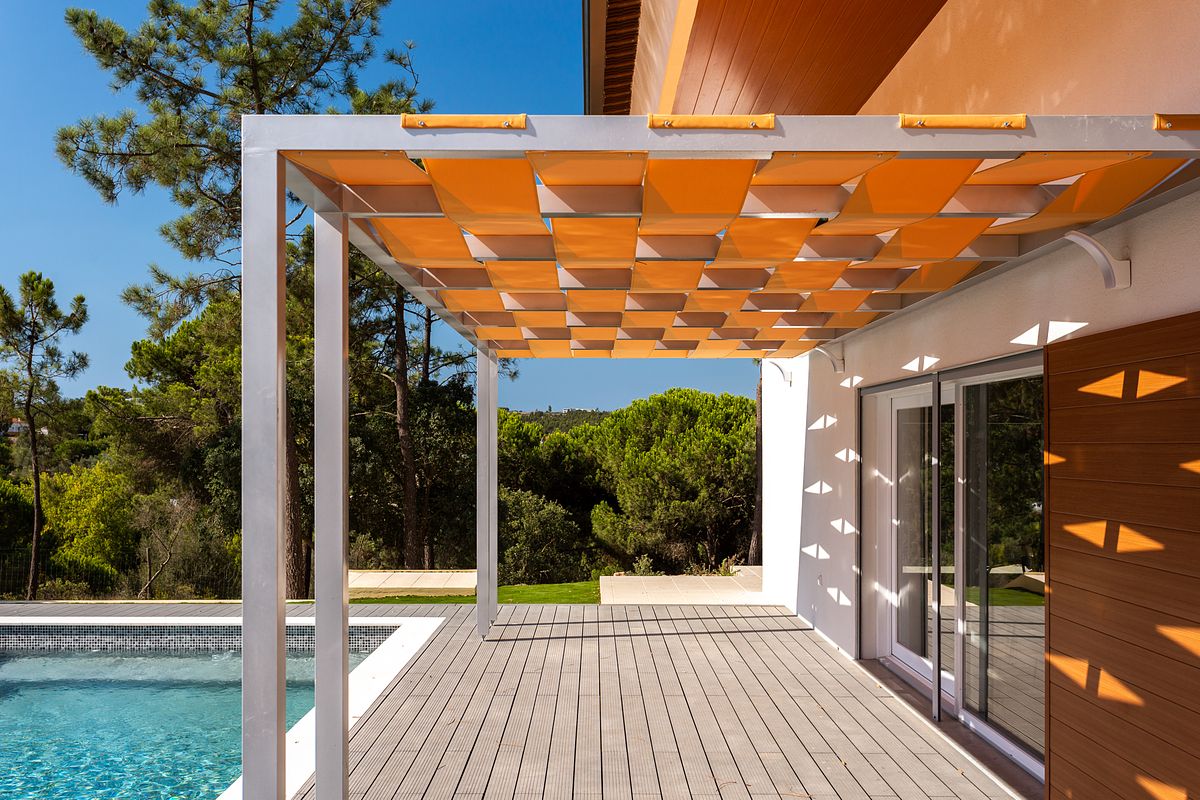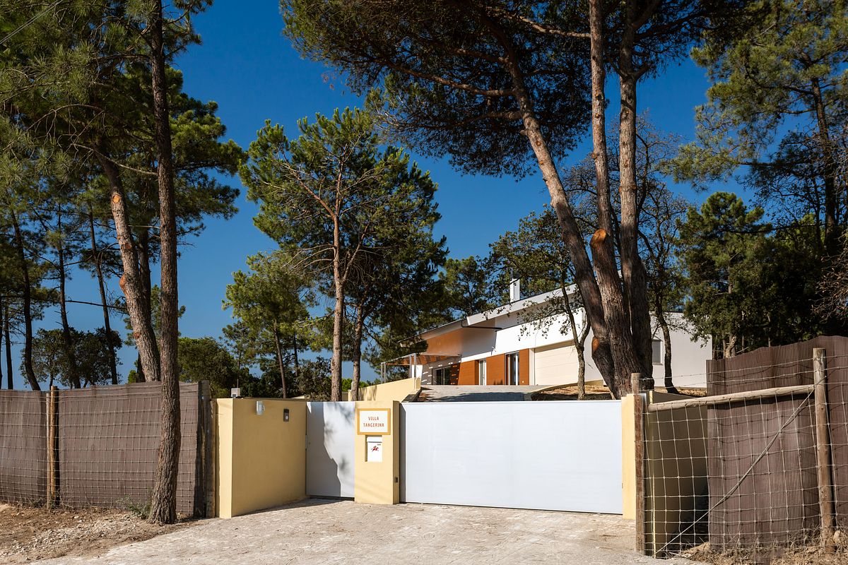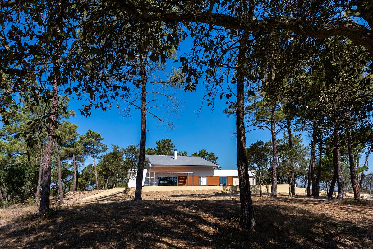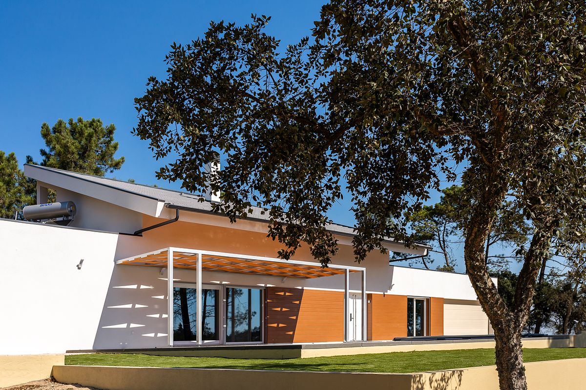 A Fachada Frontal, destaca-se a zona de entrada protegida ainda pela Cobertura, permitindo abrigo de chuvas na entrada, bem como a alpendre e piscina que se prolongam ao longo desde alçado. A garagem encontra-se também neste alçado sendo a primeira entrada precedente de uma caminho directo desde o portão da propriedade. O lote, de grande dimensões, dá lugar a um rodeado de de pinheiros e alguns sobreiros da propriedade servindo não só de privacidade como de proteção a intemperies e ventos fortes.