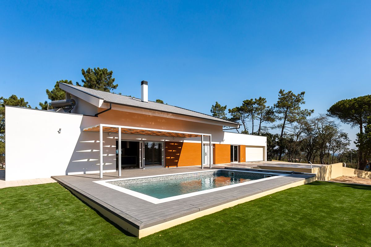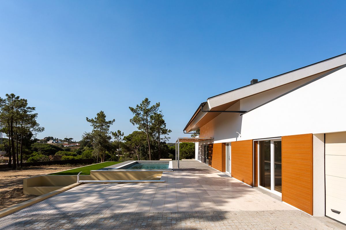 Esta Moradia está implantada nos arredores do concelho de Sesimbra, numa zona de novos loteamentos. Composta por uma volumetria não homogénea, corpo de edifício estende-se para duas alas desiguais. Os Pisos estão acima da cota da soleira, sem nenhum abaixo. No Piso 0, encontramos as áreas comuns: o hall e corredor de entrada, com acesso ao piso superior pela escada; a sala de estar encontra-se dividida cozinha com espaço para area de refeições, por uma parede central com acesso directo ao alpendre da piscina; um quarto, uma instalação sanitária de apoio e quarto com possibilidade de escritório e/ou arrumos. Ainda na Cozinha podemos encontrar uma ampla Lavandaria.