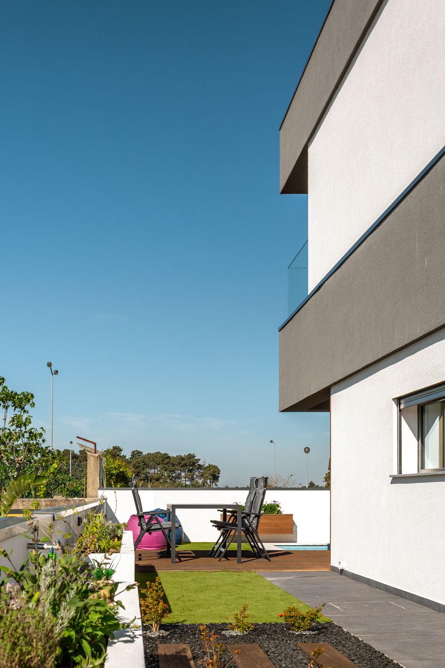 The front facade, parallel to the public road, allows for parking space and there is a drawback of the main volume, in the entrance area, adjacent to the parking space, allowing shelter from the rain at the entrance. The small size of the plot, allows exterior circulation on the front with a small garden and lake, on the left side of the house and giving access to the backspace of the pool and porch.