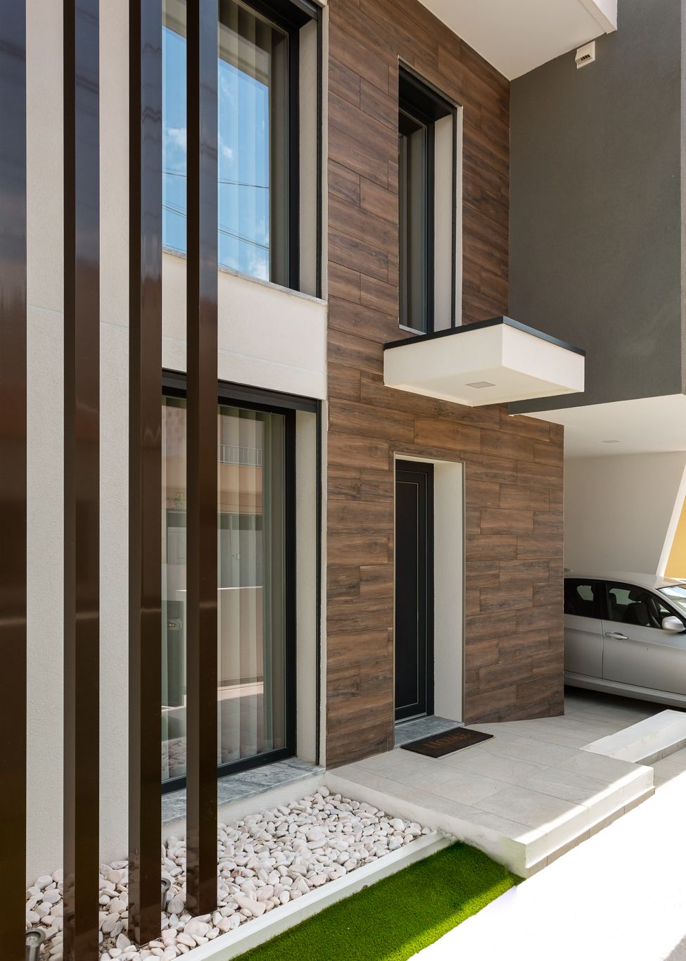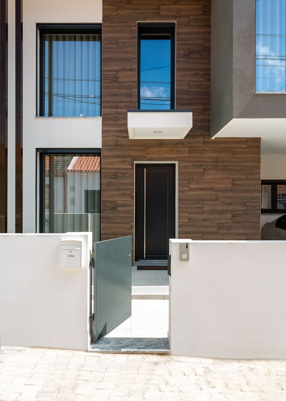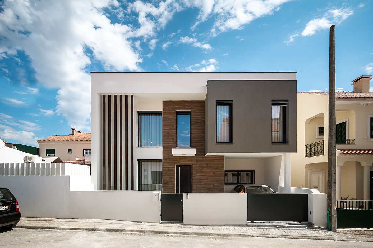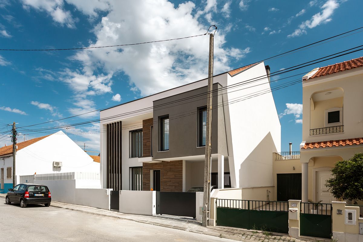 As Fachadas Frontal e Posterior estão a Poente e Nascente respectivamente. Não existe circulação em redor do edifício. a Fachada Frontal é recolhida do lado direito dando espaço para um lugar de estacionamento.