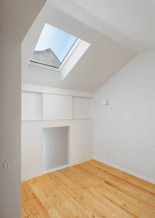 Reinvented suite. From the atrium, through the stairs, there is also access to the Suite, which is located on the mezzanine floor.With 10.75 m2, the Suite is located next to the roof, taking advantage of the attic area and ensuring its natural lighting and ventilation through a roof window and two interior windows, at each end of the room, aligned with the respective exterior windows, allowing cross ventilation of the space.With a 1.60 m wardrobe, the Suite also contains a small private bathroom installation, inspired by aeronautical solutions, to offer a washbasin, toilet and shower in a limited and comfortably functional space.
