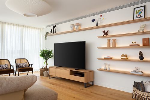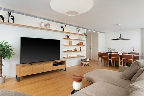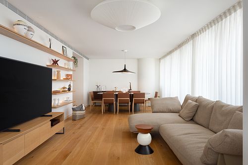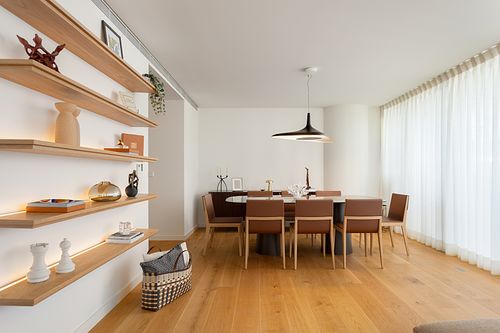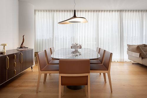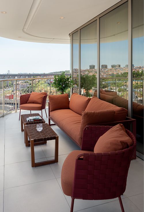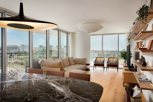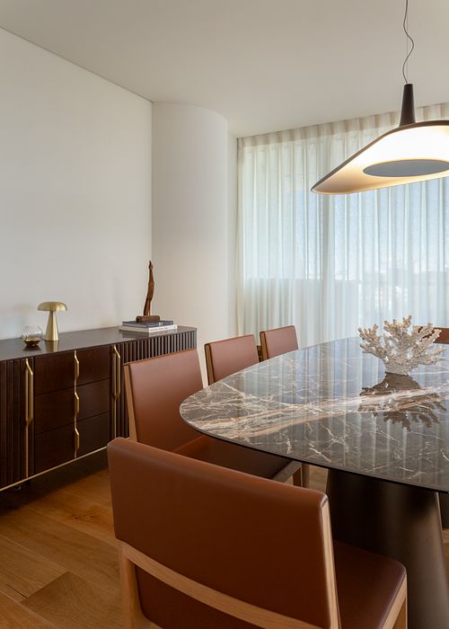 A paleta cromática foi inspirada nos tons suaves da cidade, conjugando madeiras naturais, mármores portugueses e acabamentos metálicos discretos. A iluminação foi cuidadosamente projetada para criar diferentes atmosferas ao longo do dia, realçando texturas e volumes. Mobiliário assinado por designers europeus e peças de arte local completam o ambiente com elegância e identidade. O resultado é um espaço exclusivo que alia o luxo discreto à vivência prática, inserido num dos edifícios mais icónicos da capital — com vistas privilegiadas e acesso a serviços de excelência.