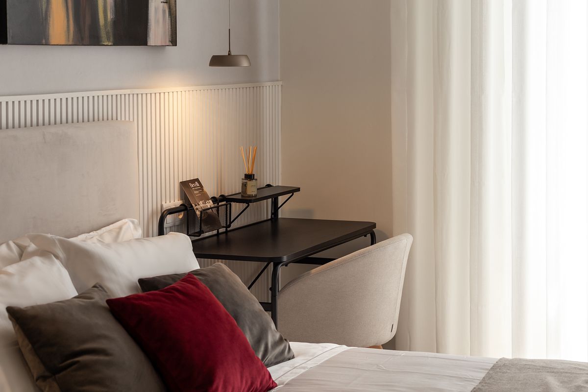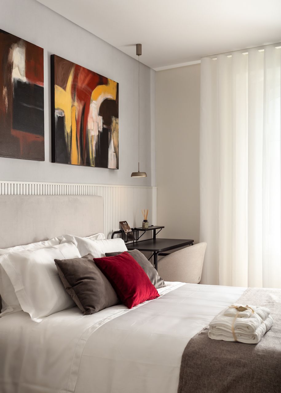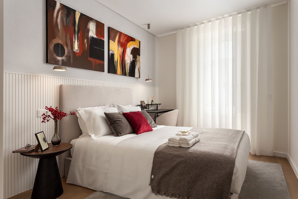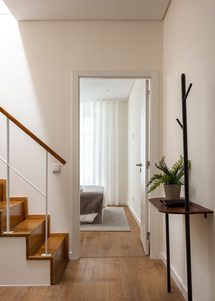 Na cozinha, o desenho é limpo e funcional, com acabamentos claros e iluminação que realça materiais e detalhes. Nos quartos, a atmosfera é tranquila e organizada, com roupa de cama neutra, iluminação pontual e pequenos elementos gráficos que dão carácter sem “pesar” o espaço.