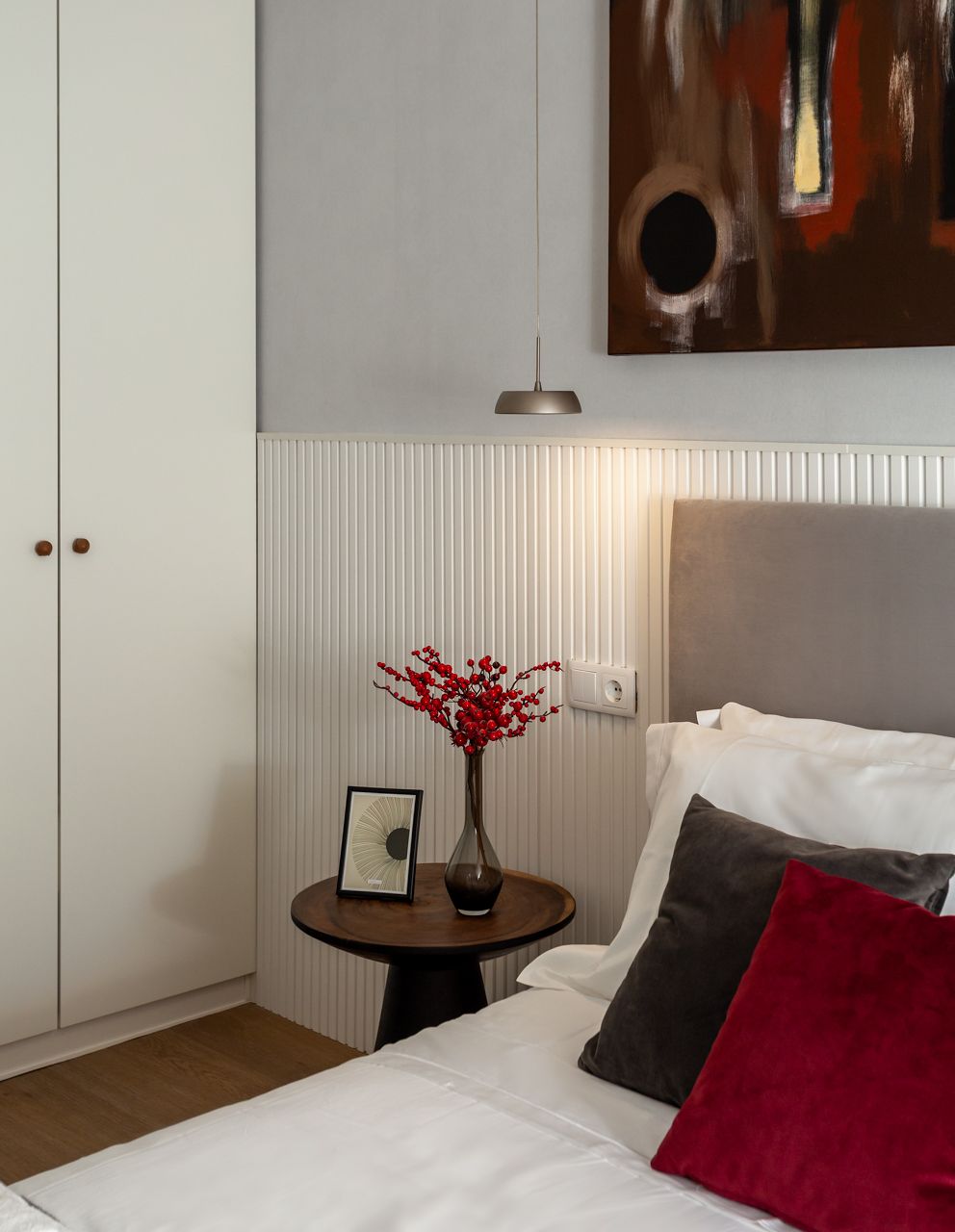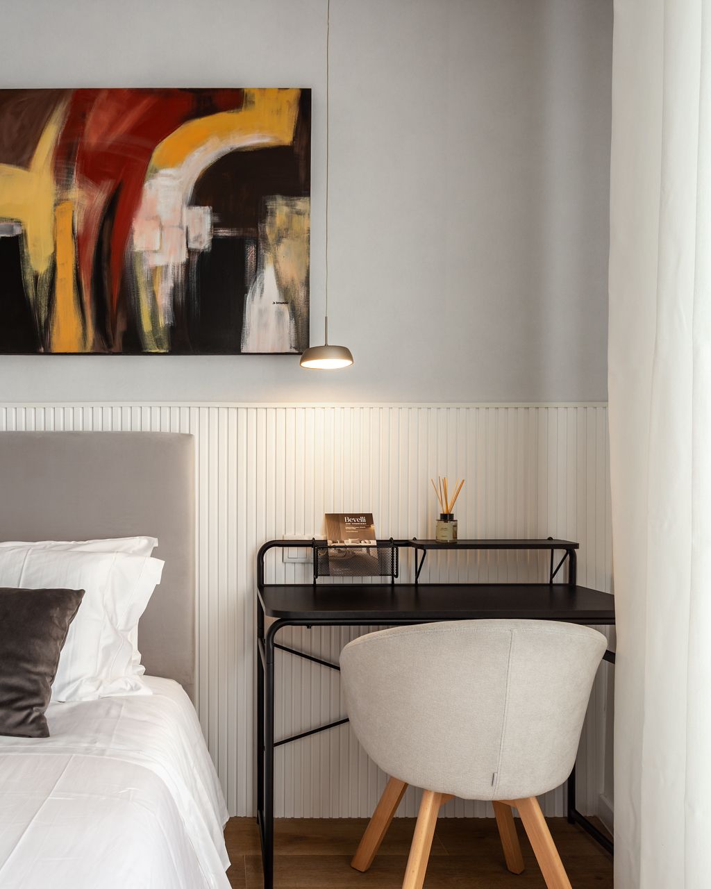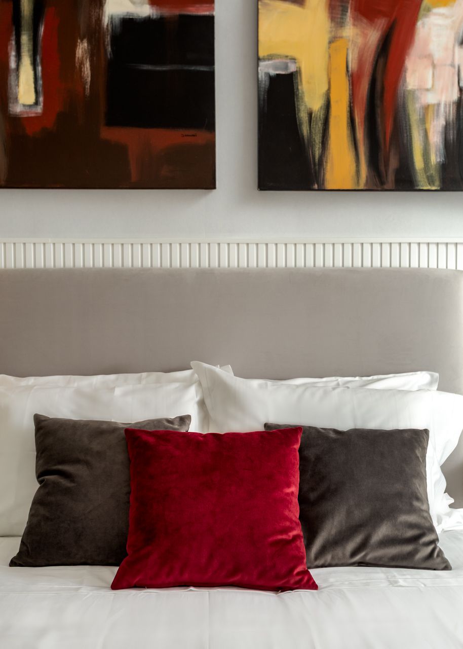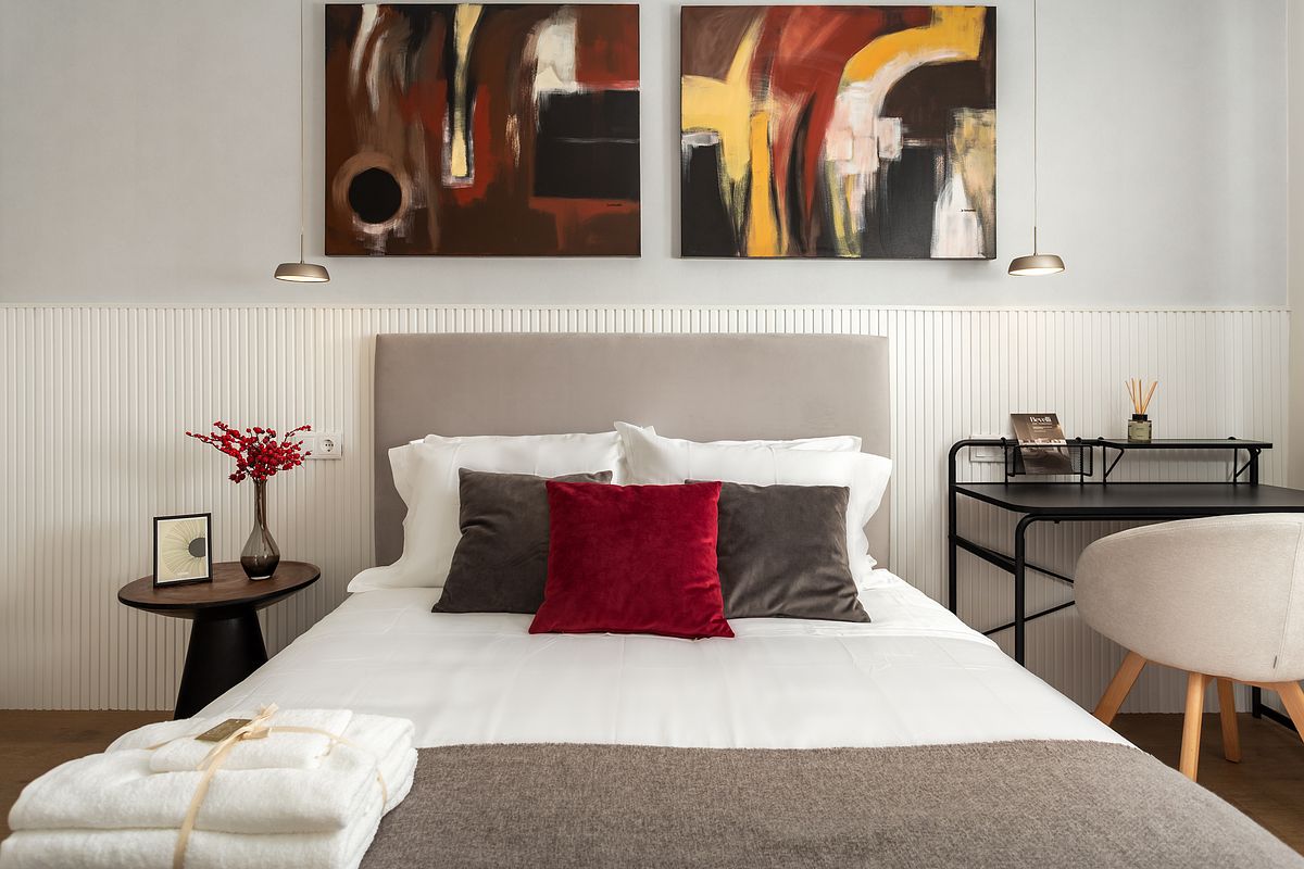 Na cozinha, o desenho é limpo e funcional, com acabamentos claros e iluminação que realça materiais e detalhes. Nos quartos, a atmosfera é tranquila e organizada, com roupa de cama neutra, iluminação pontual e pequenos elementos gráficos que dão carácter sem “pesar” o espaço.