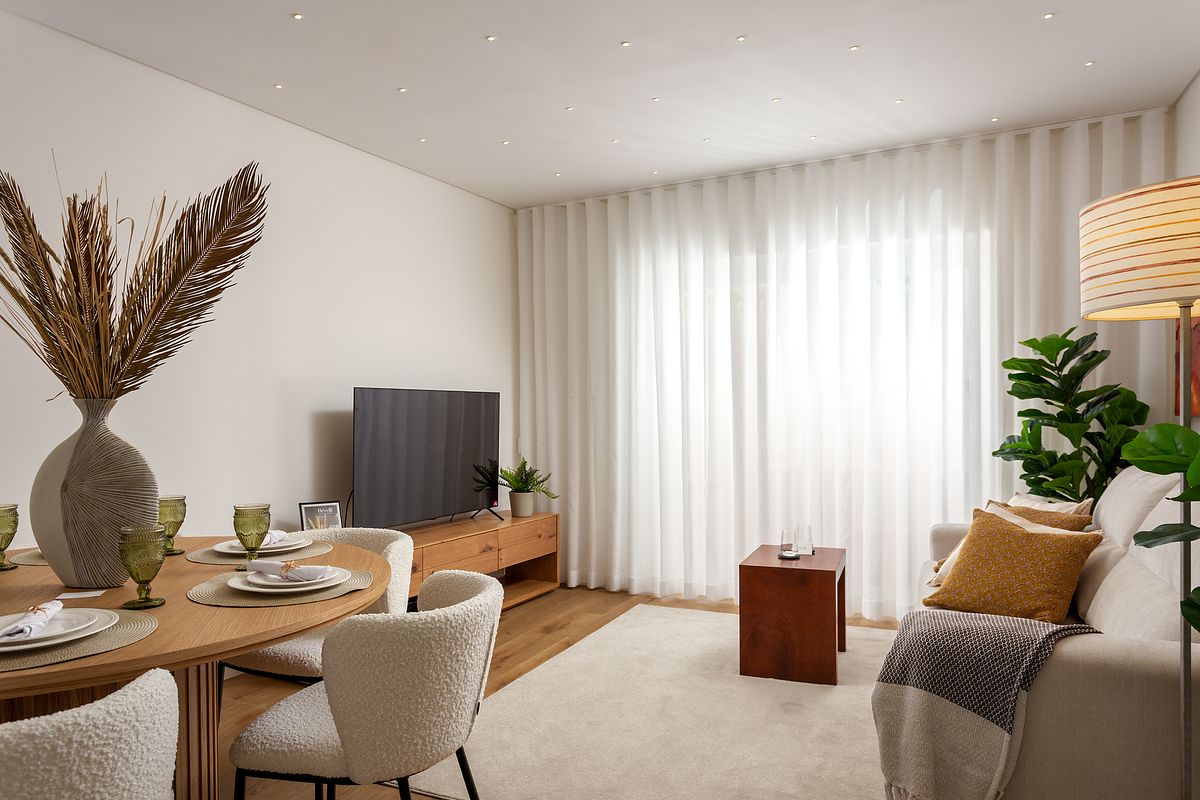 Este projeto de design de interiores e home staging, assinado pela Bevelli Home, mostra como um apartamento de dimensões compactas pode ganhar amplitude, conforto e uma identidade visual consistente. A abordagem parte de uma base contemporânea e intemporal, com linhas simples, materiais quentes e uma paleta neutra, pensada para fotografar bem e para valorizar o imóvel na apresentação a potenciais compradores ou arrendatários.