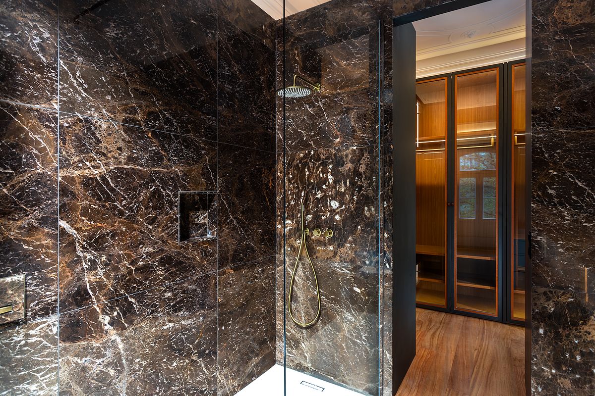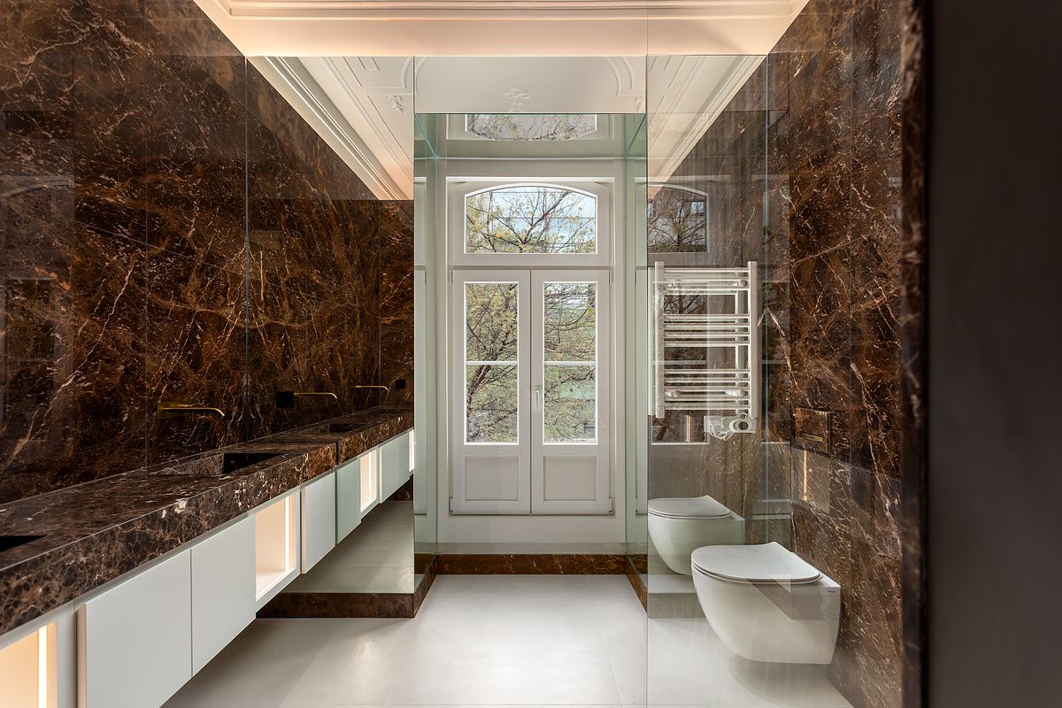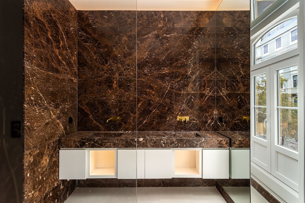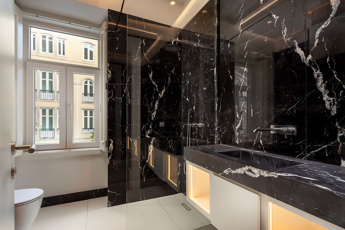 Um dos principais desafios desta reportagem foi a representação fiel das casas de banho, onde se destaca a utilização de mármore Castanho Imperador. A fotografia destes materiais exige controlo absoluto de luz, contraste e cor, de forma a revelar textura, veios e profundidade sem distorções cromáticas ou brilhos excessivos.