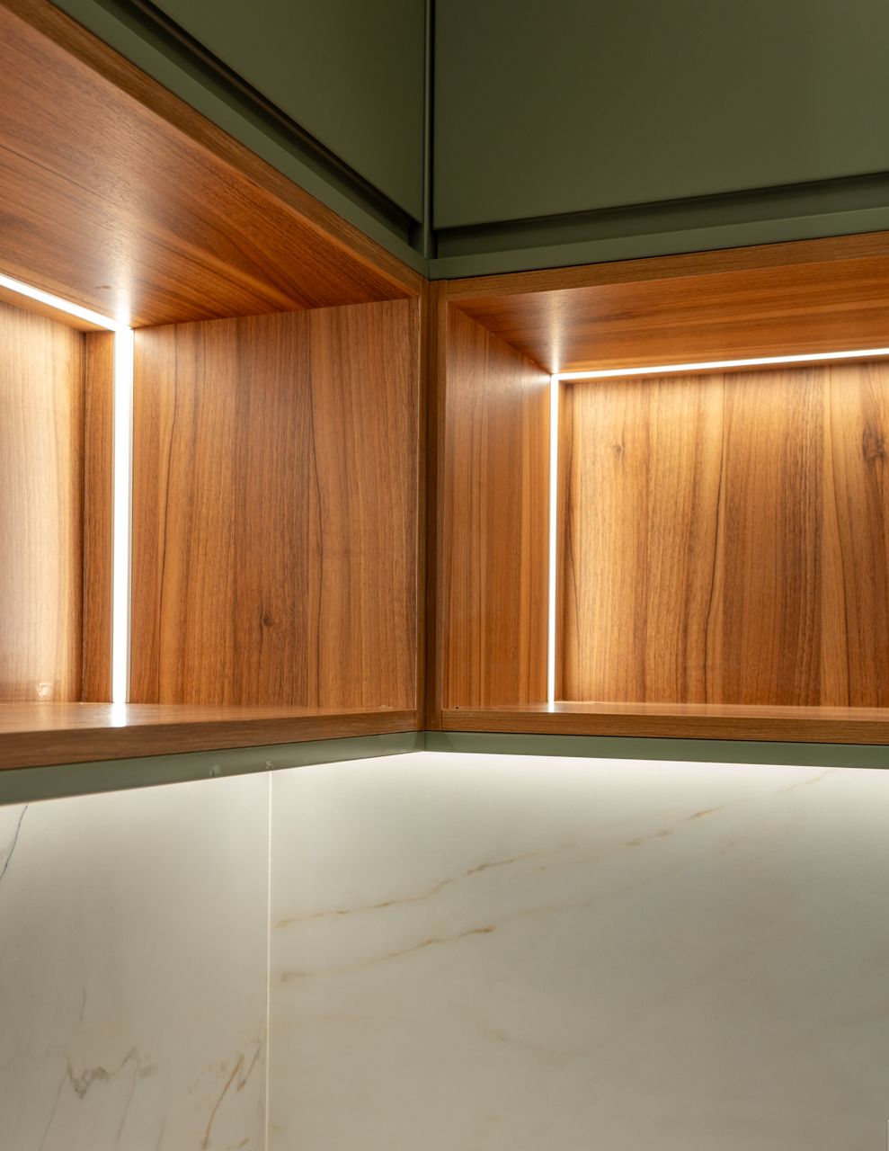 A iluminação interior, cuidadosamente desenhada pela Femma Interior Design, foi outro elemento central do trabalho fotográfico. Desde a iluminação integrada nos roupeiros e closets, até aos sistemas embutidos nas zonas de circulação, cada cenário exigiu soluções específicas para revelar o interior dos espaços, controlar reflexos em superfícies envidraçadas e manter uma leitura natural e equilibrada da luz.