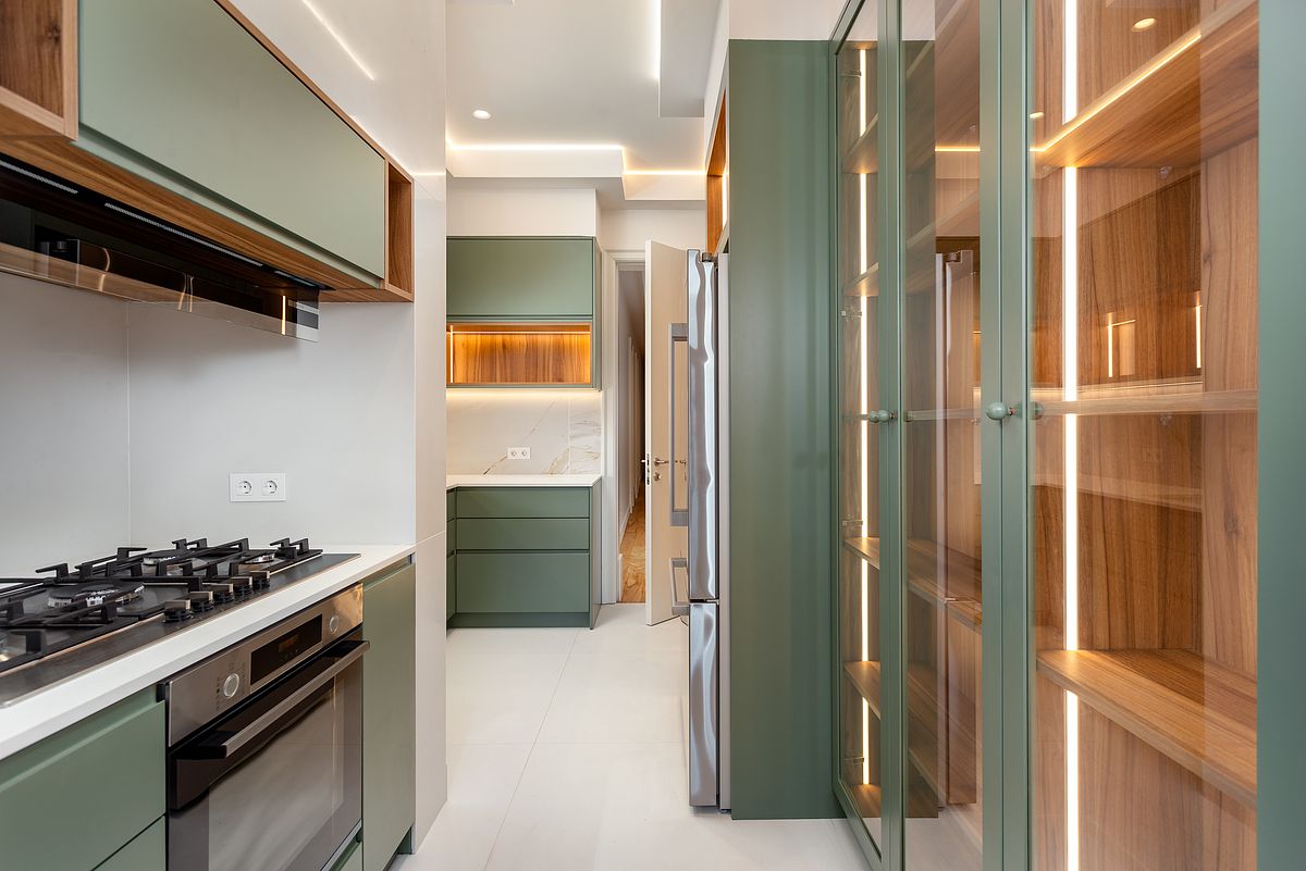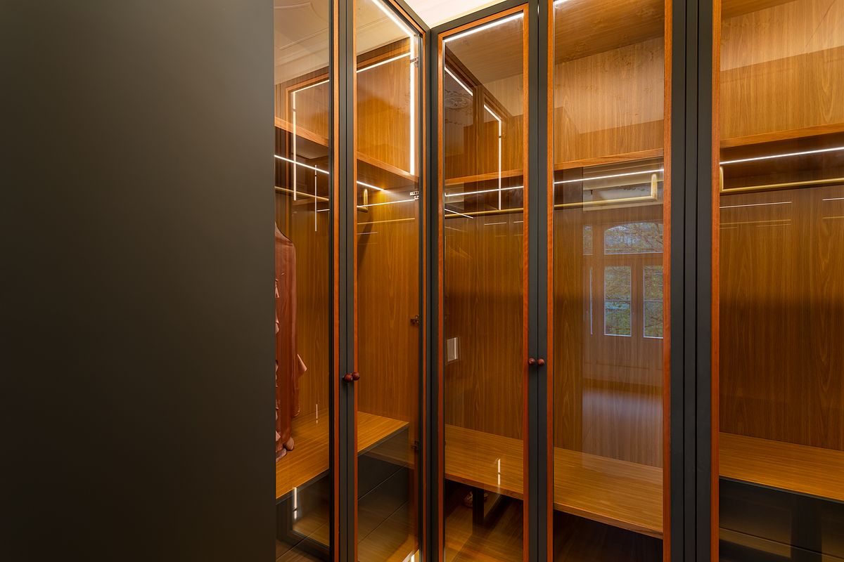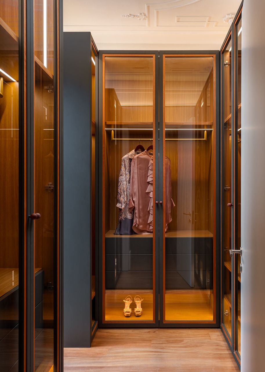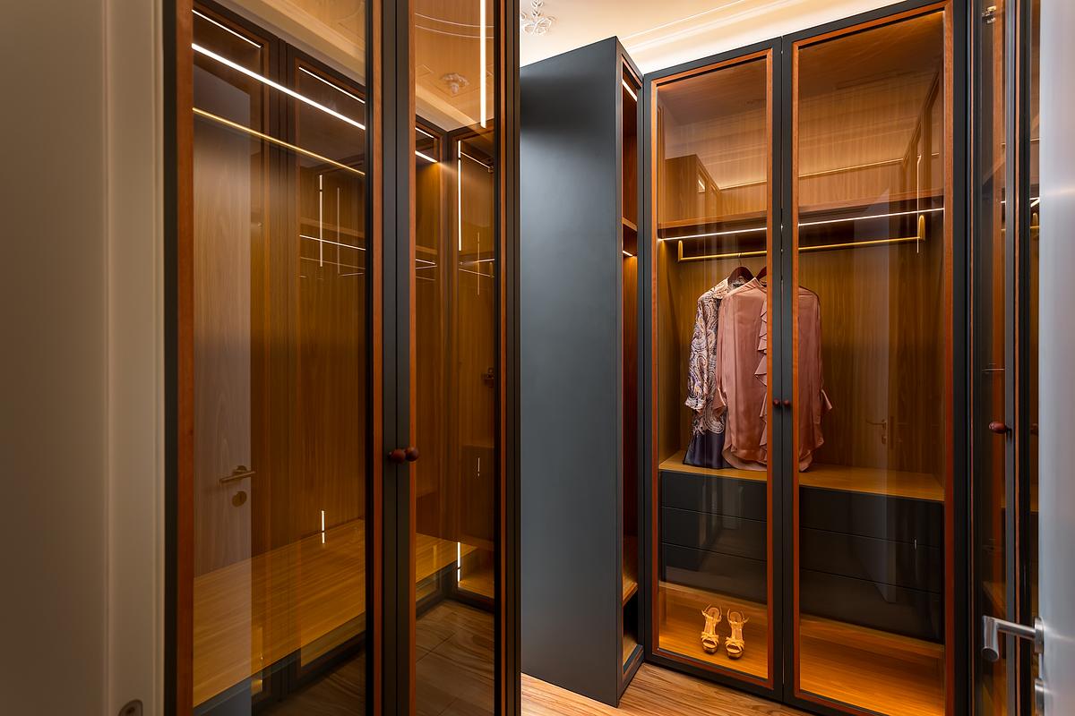 O closet representou um dos momentos mais técnicos da reportagem, exigindo um trabalho minucioso de iluminação e posicionamento para mostrar simultaneamente o interior dos armários, os materiais, os sistemas de iluminação e a profundidade do espaço, sem comprometer a naturalidade da imagem.