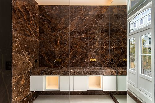 Paredes revestidas a pedra de MÁRMORE CASTANHO IMPERADOR, como na bancada com 2 lavatórios.