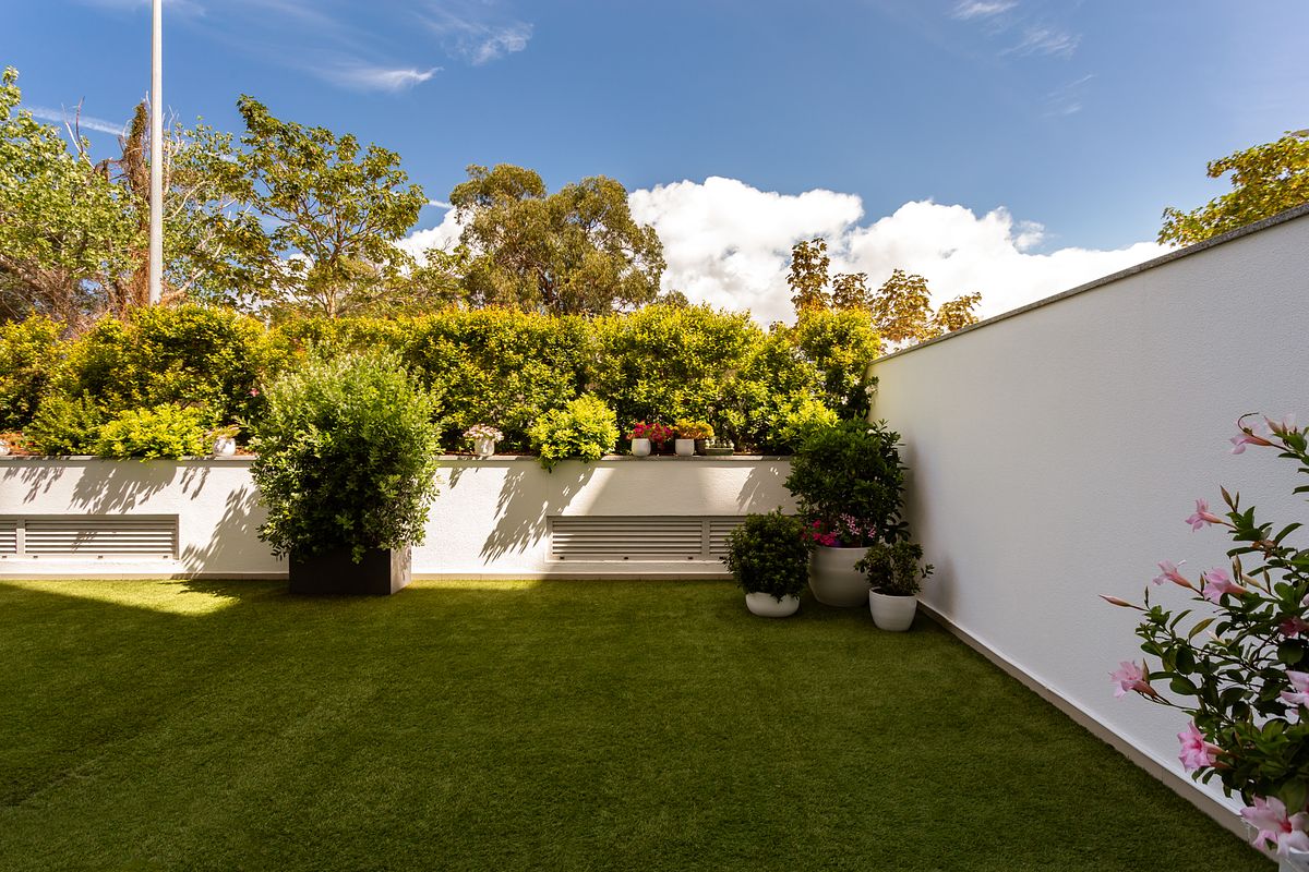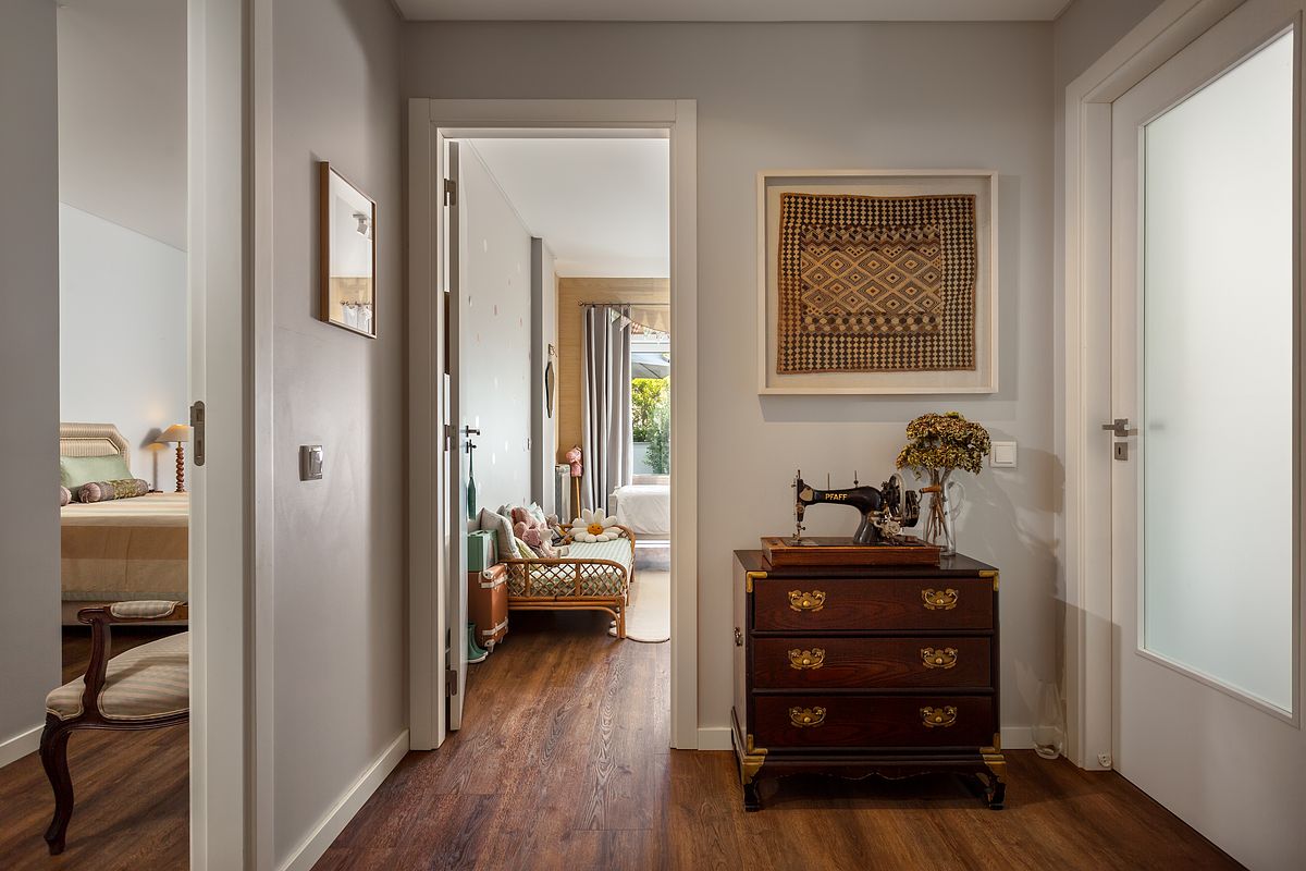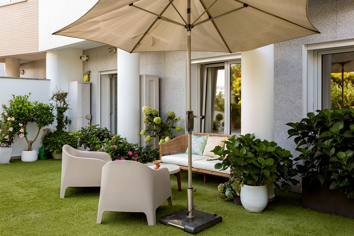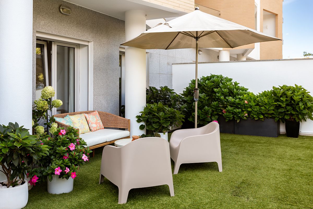 O terraço traseiro foi igualmente tratado como parte integrante da experiência do apartamento. Apesar da sua dimensão contida, foi fotografado com o mesmo cuidado aplicado aos interiores, valorizando a sua função como espaço complementar e reforçando a sensação de ligação entre interior e exterior.