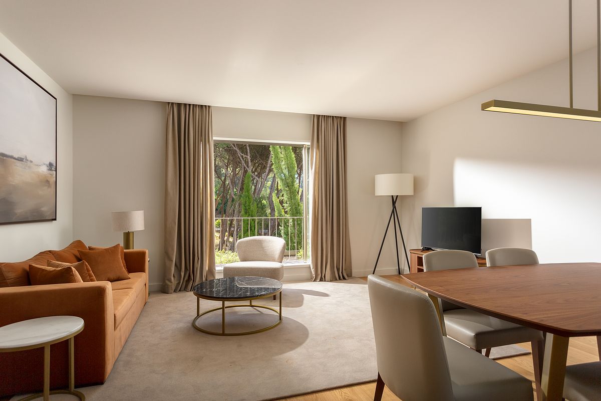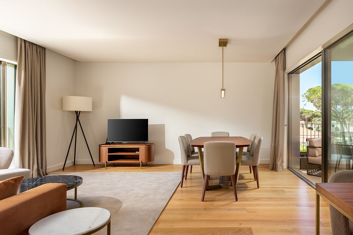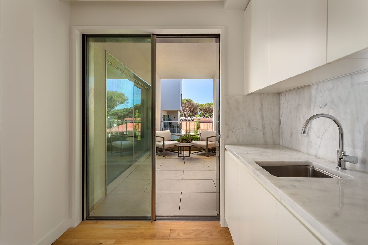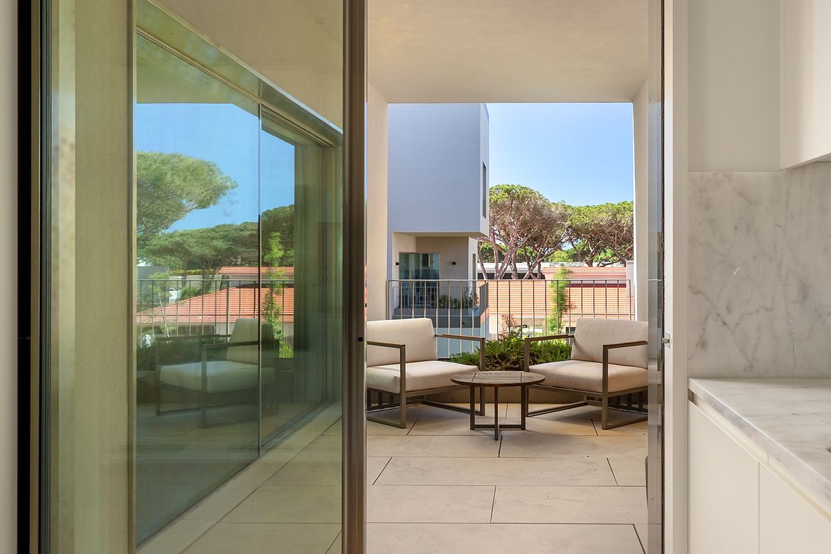 A varanda e as áreas exteriores foram igualmente valorizadas, reforçando a ligação do apartamento à paisagem envolvente e à identidade do Marinha Prime, um fator determinante no processo de decisão de compra. Estas imagens permitem contextualizar o imóvel no seu ambiente natural e diferenciar a oferta no mercado imobiliário de Cascais.