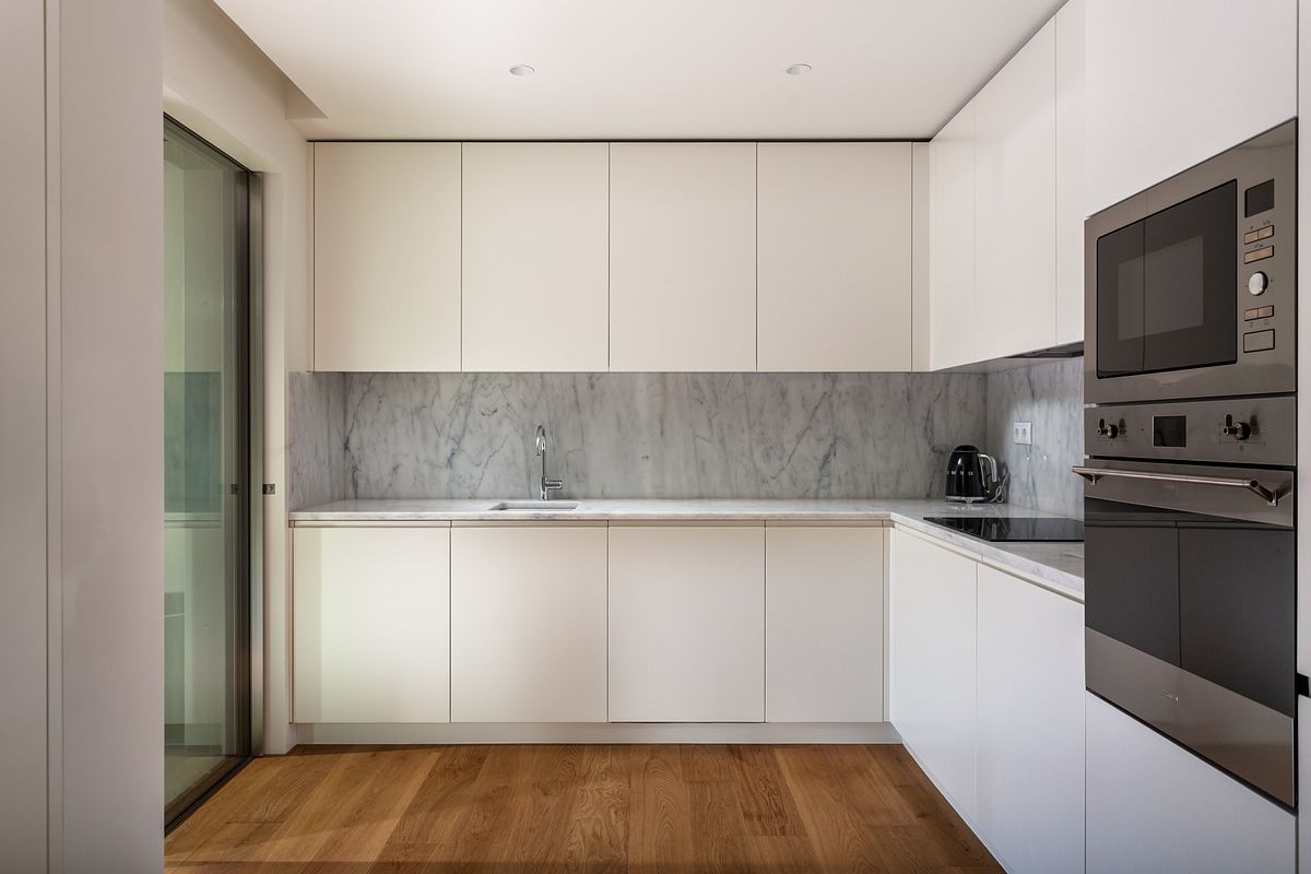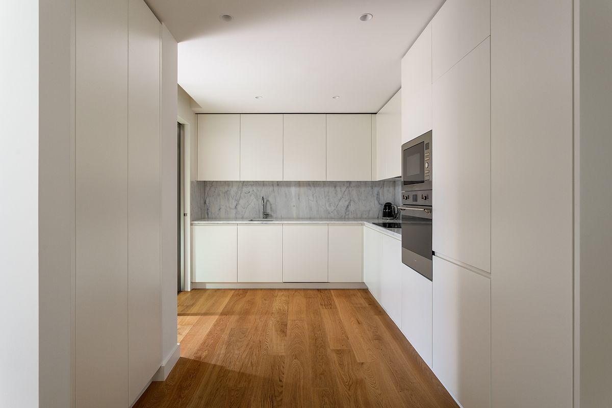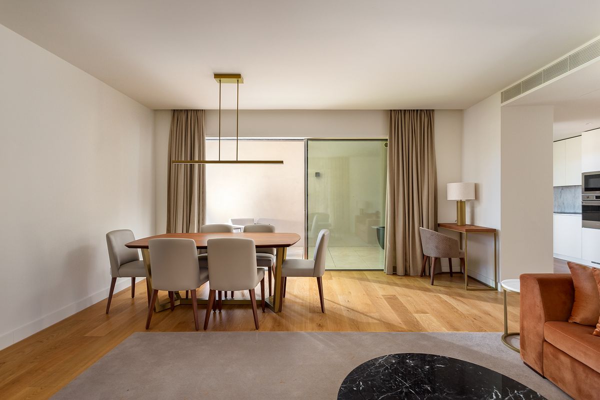 A zona social foi fotografada de forma a evidenciar a fluidez entre sala, zona de refeições e cozinha, garantindo uma leitura clara das proporções, dos materiais e da distribuição do espaço. O controlo rigoroso da exposição permitiu preservar a neutralidade cromática dos interiores, assegurando uma representação fiel dos acabamentos e da atmosfera real do apartamento.