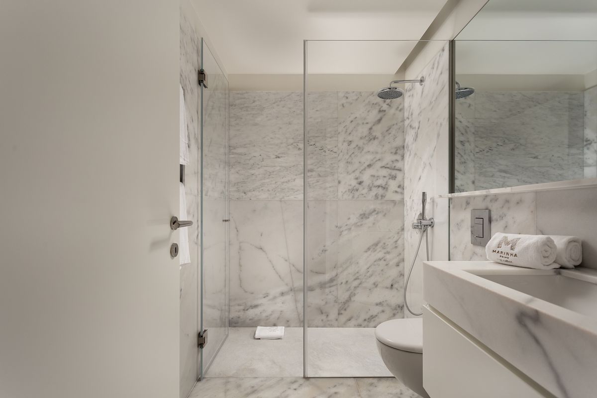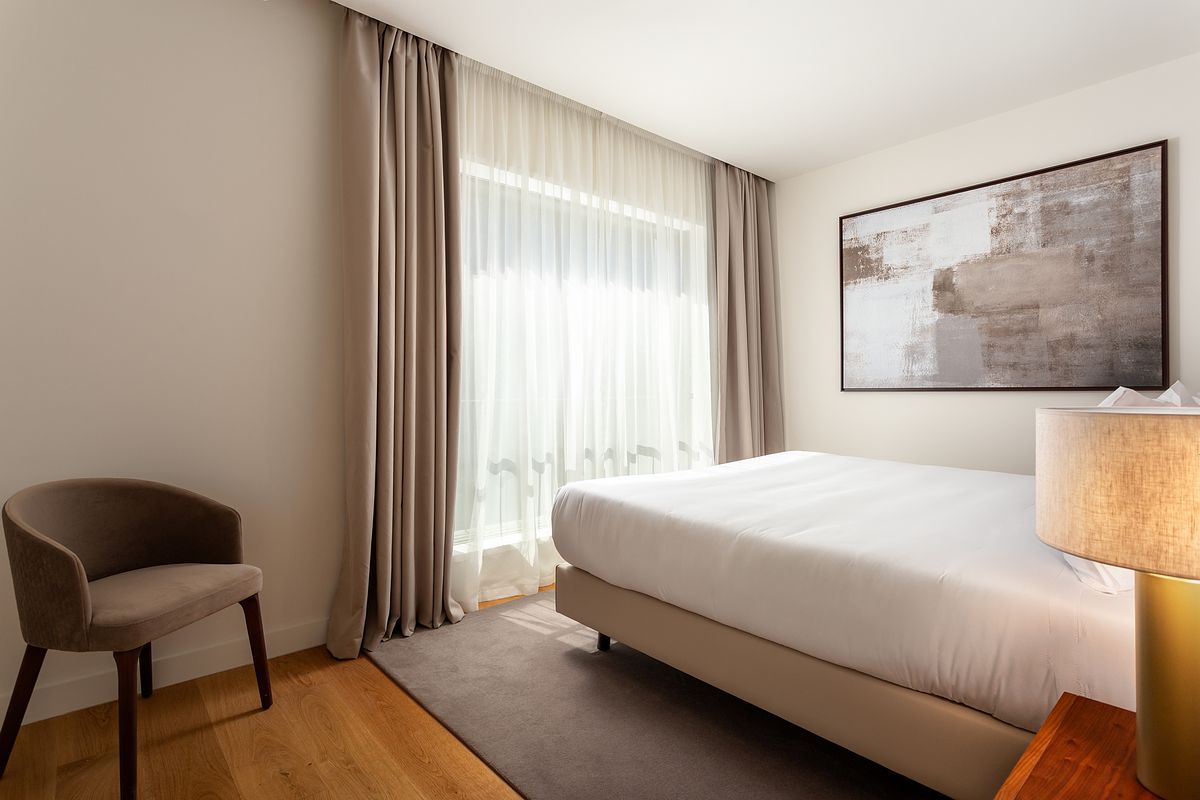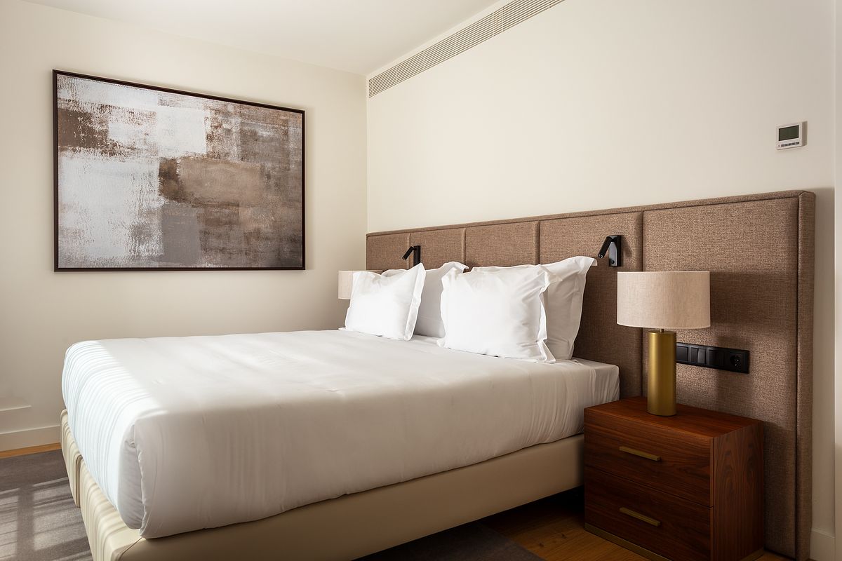 No quarto, a abordagem fotográfica privilegiou o conforto e a serenidade do espaço, com especial atenção à entrada de luz natural, à textura dos tecidos e à relação visual com o exterior. A casa de banho, revestida a mármore, foi captada com foco na leitura correta das superfícies, volumes e reflexos, elementos fundamentais em imóveis deste segmento.