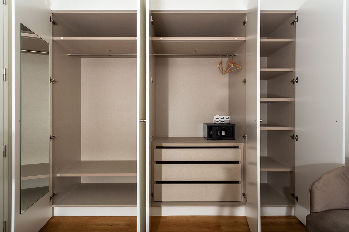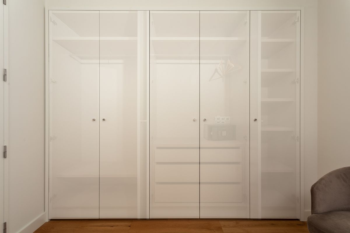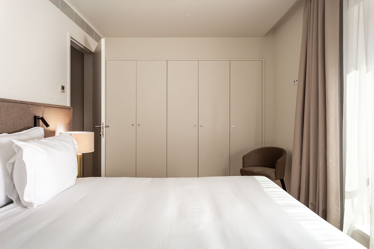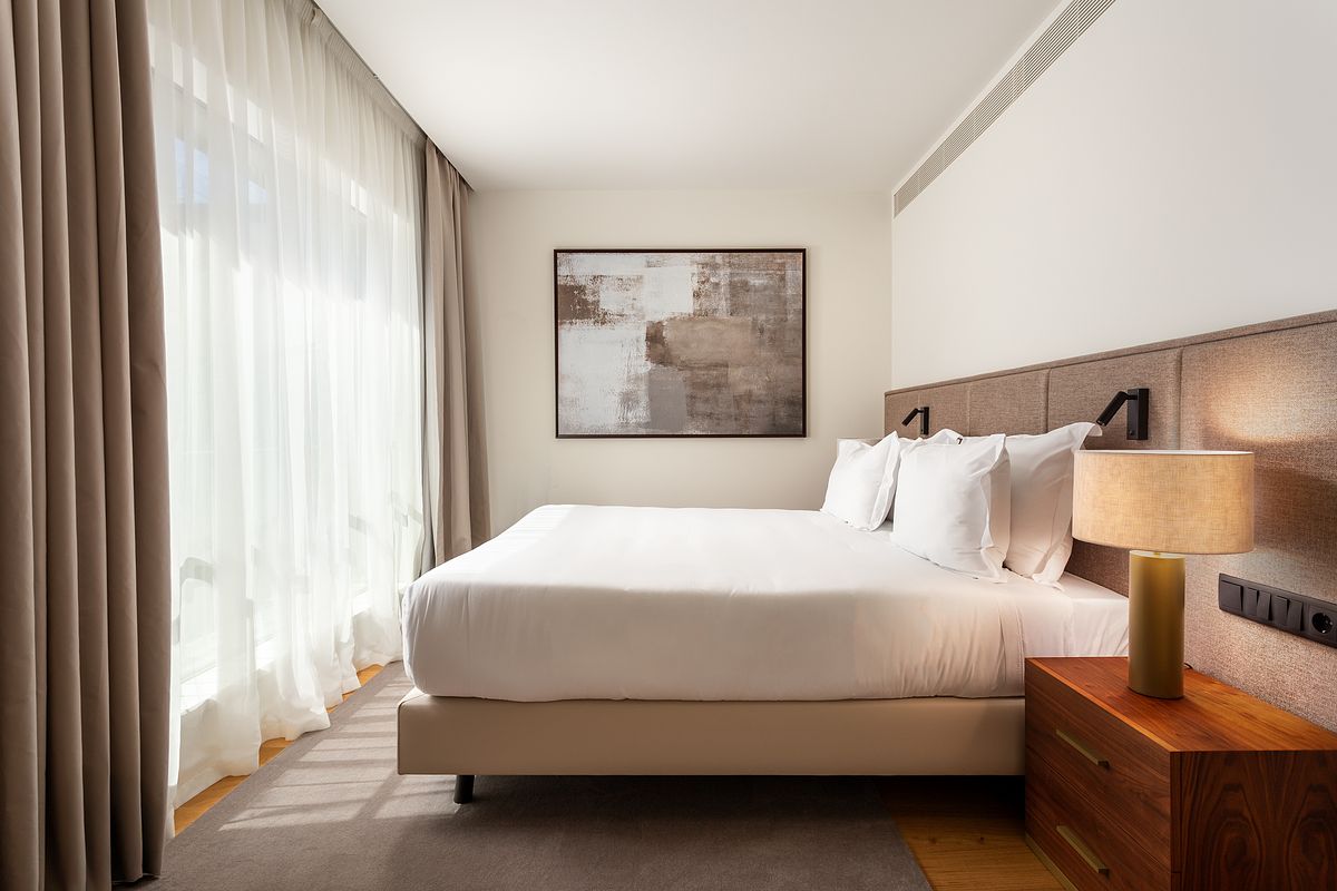 No quarto, a abordagem fotográfica privilegiou o conforto e a serenidade do espaço, com especial atenção à entrada de luz natural, à textura dos tecidos e à relação visual com o exterior. A casa de banho, revestida a mármore, foi captada com foco na leitura correta das superfícies, volumes e reflexos, elementos fundamentais em imóveis deste segmento.
