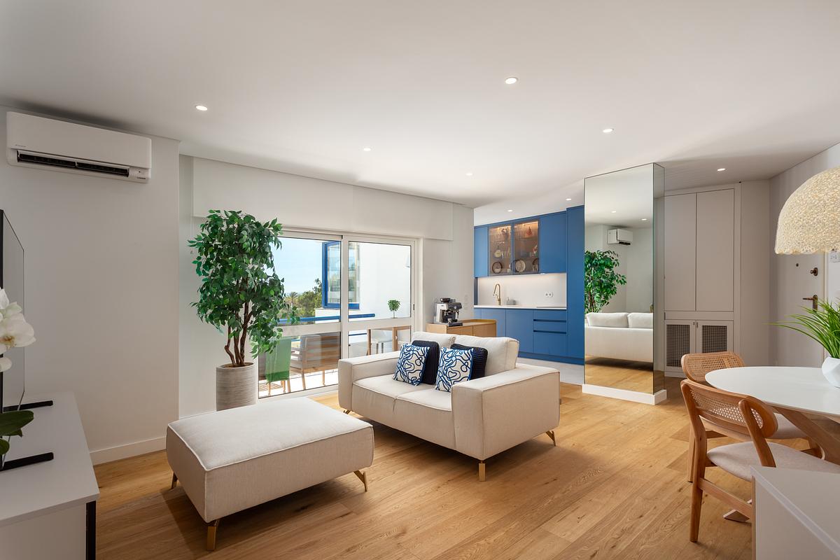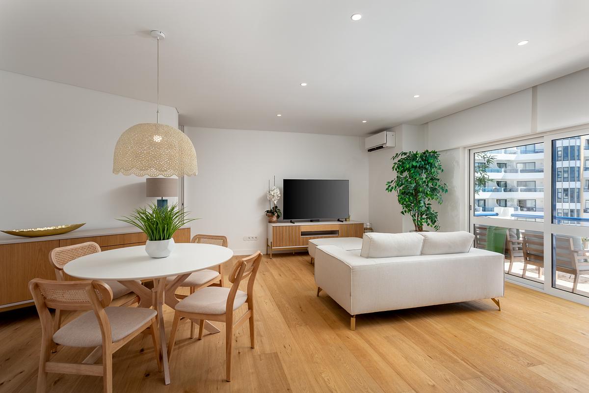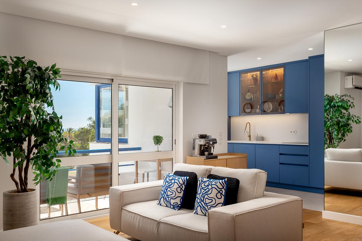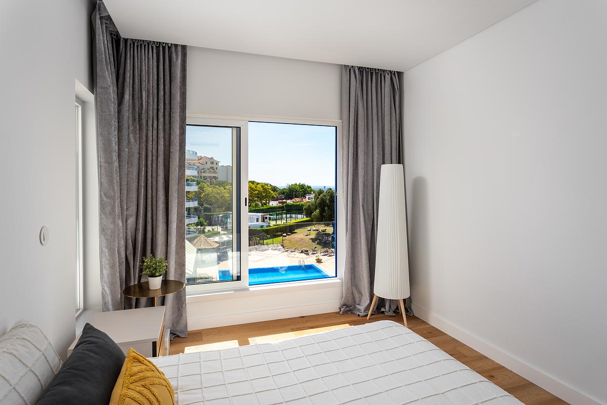 O apartamento destaca-se pelas vistas abertas para o oceano Atlântico e para a piscina do condomínio, criando uma forte ligação visual entre o interior e o exterior. Um dos principais objetivos desta reportagem foi precisamente valorizar essa relação entre a arquitetura, a paisagem e os espaços exteriores, fundamentais na decisão de compra de imóveis premium.