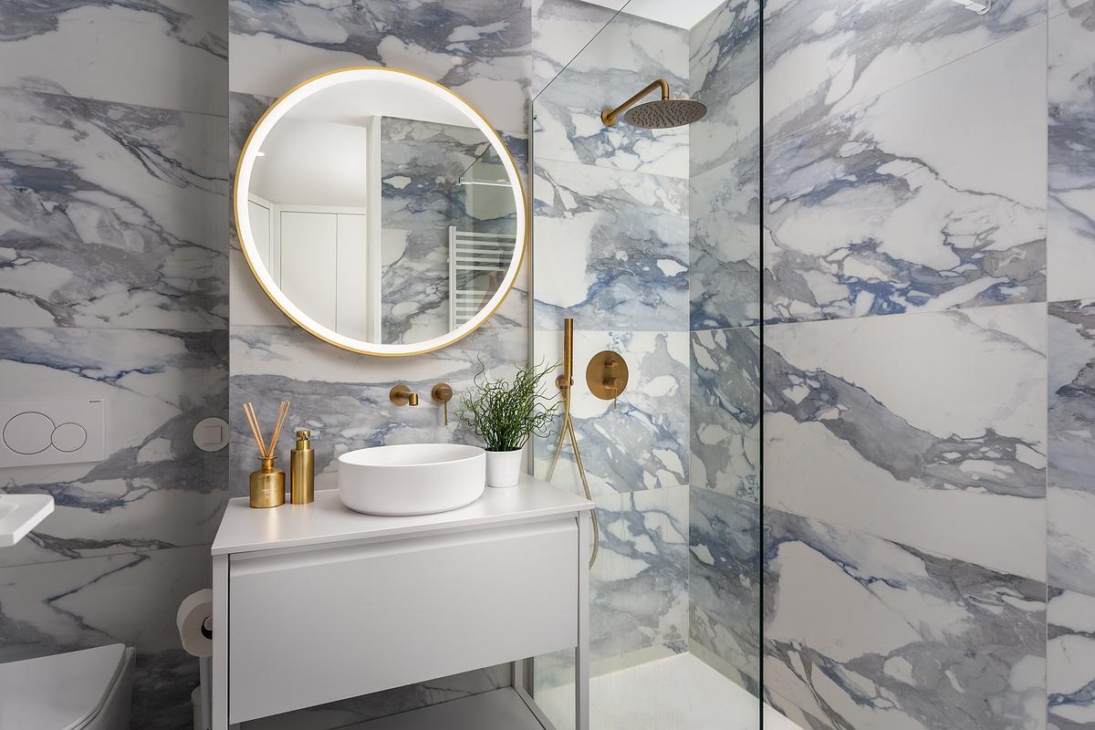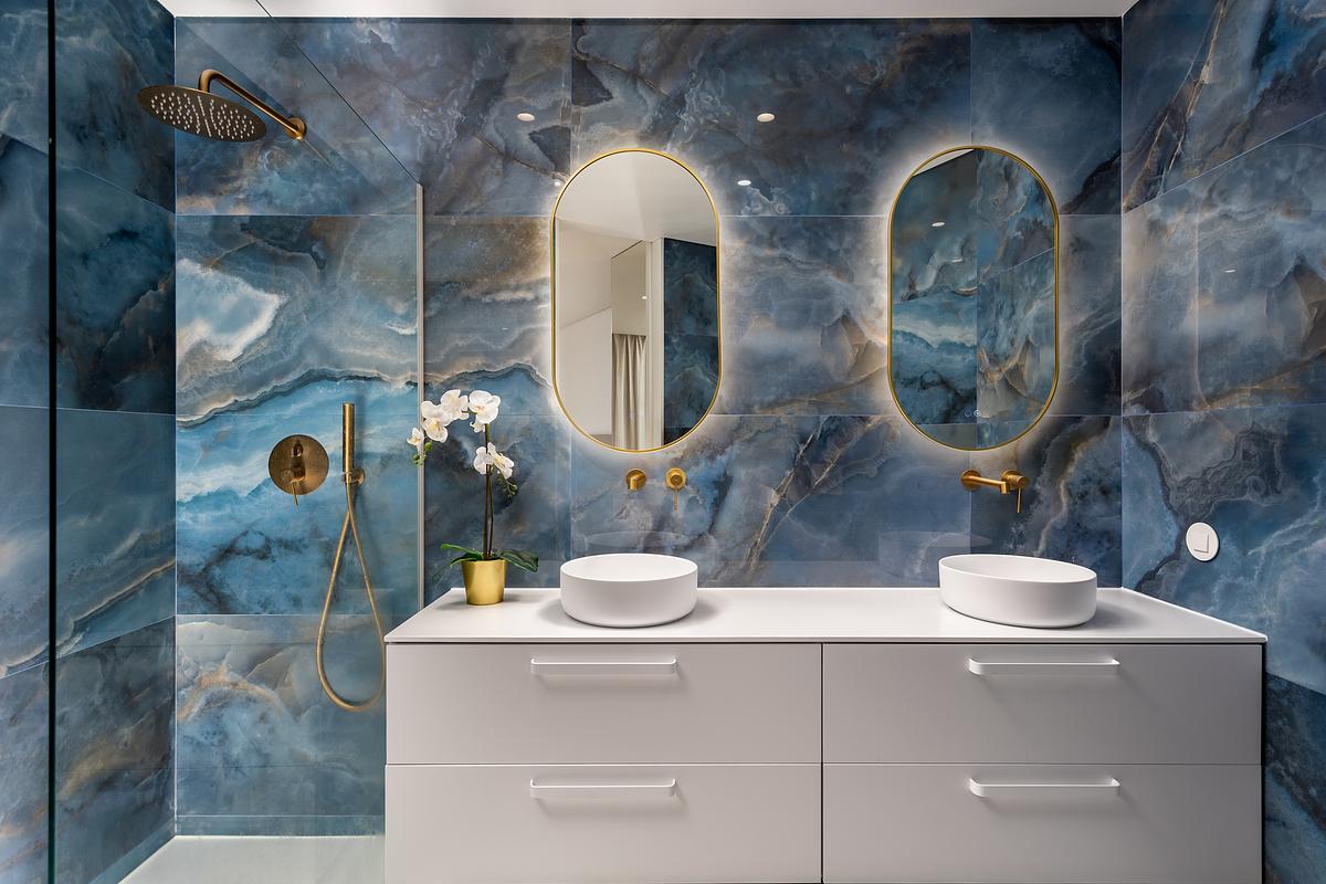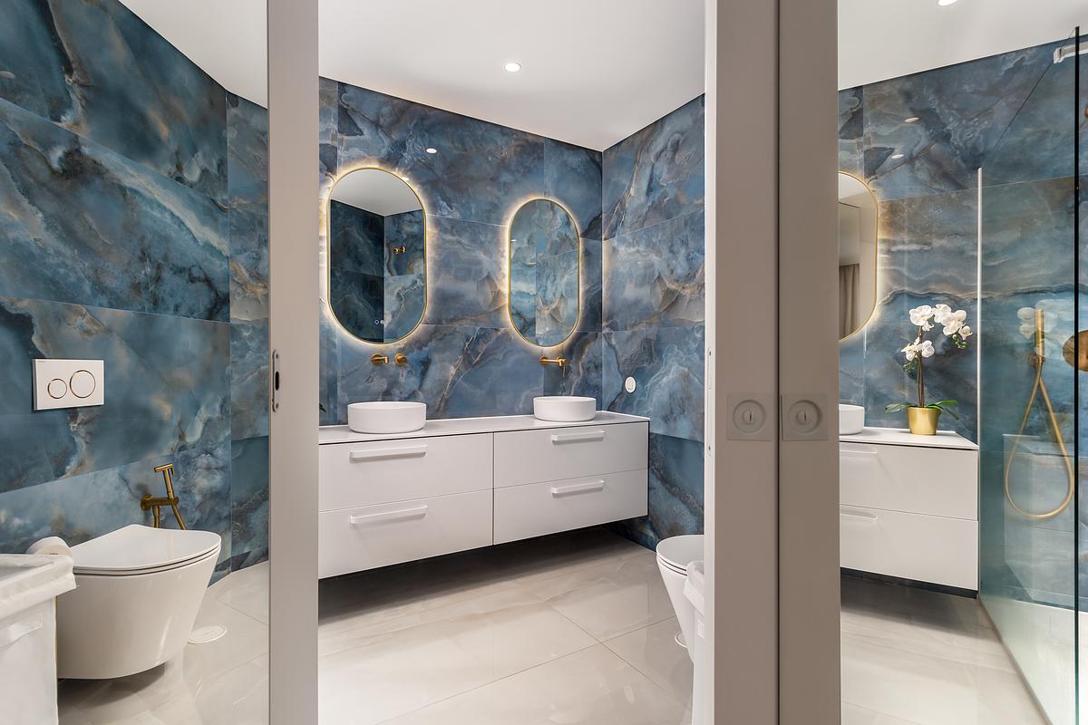 O imóvel foi integralmente remodelado e apresenta uma decoração contemporânea e sofisticada. Um dos elementos mais marcantes são as casas de banho, revestidas com mármores de tonalidades azuladas e marmoreados exclusivos, cuja reprodução fiel de cor e textura foi um ponto central desta reportagem fotográfica.