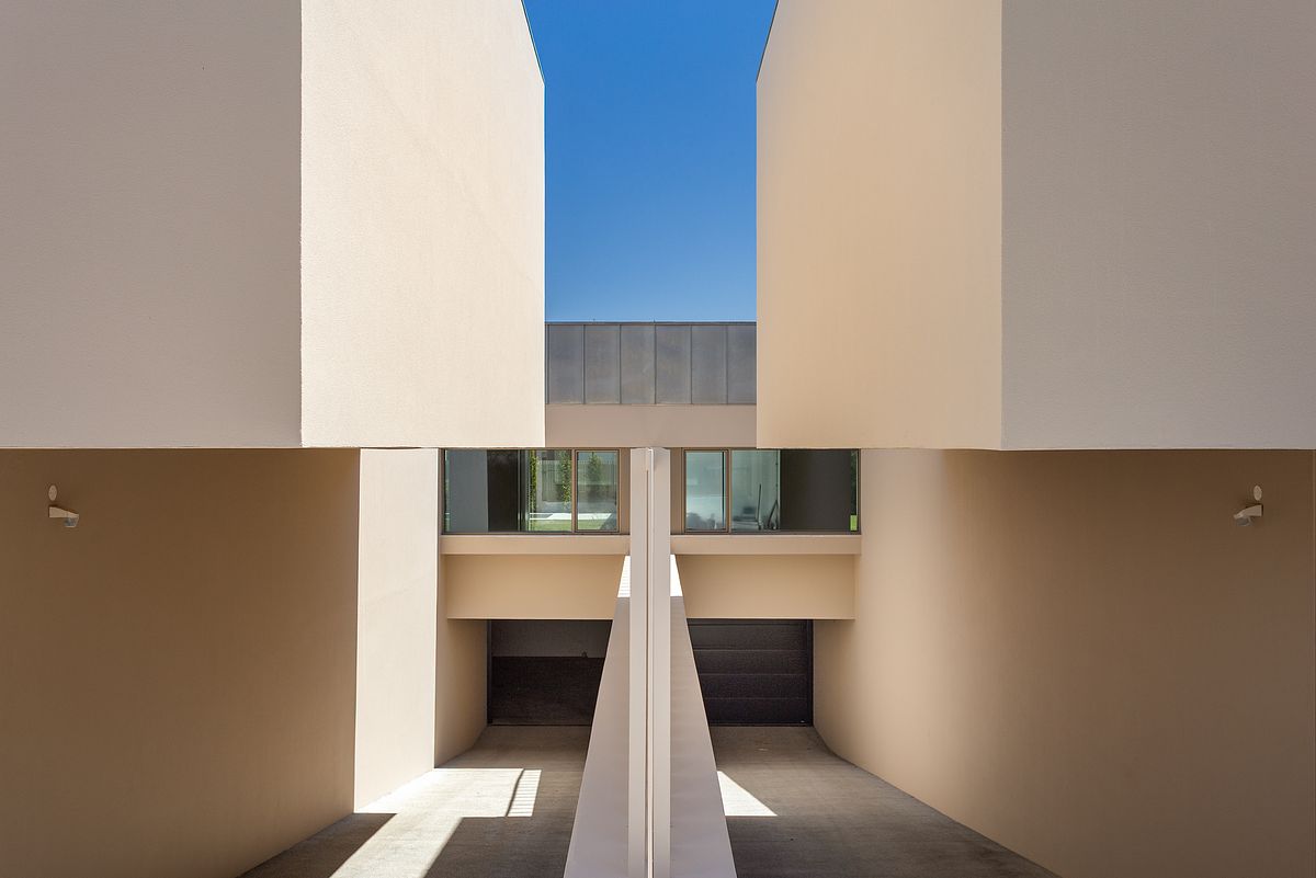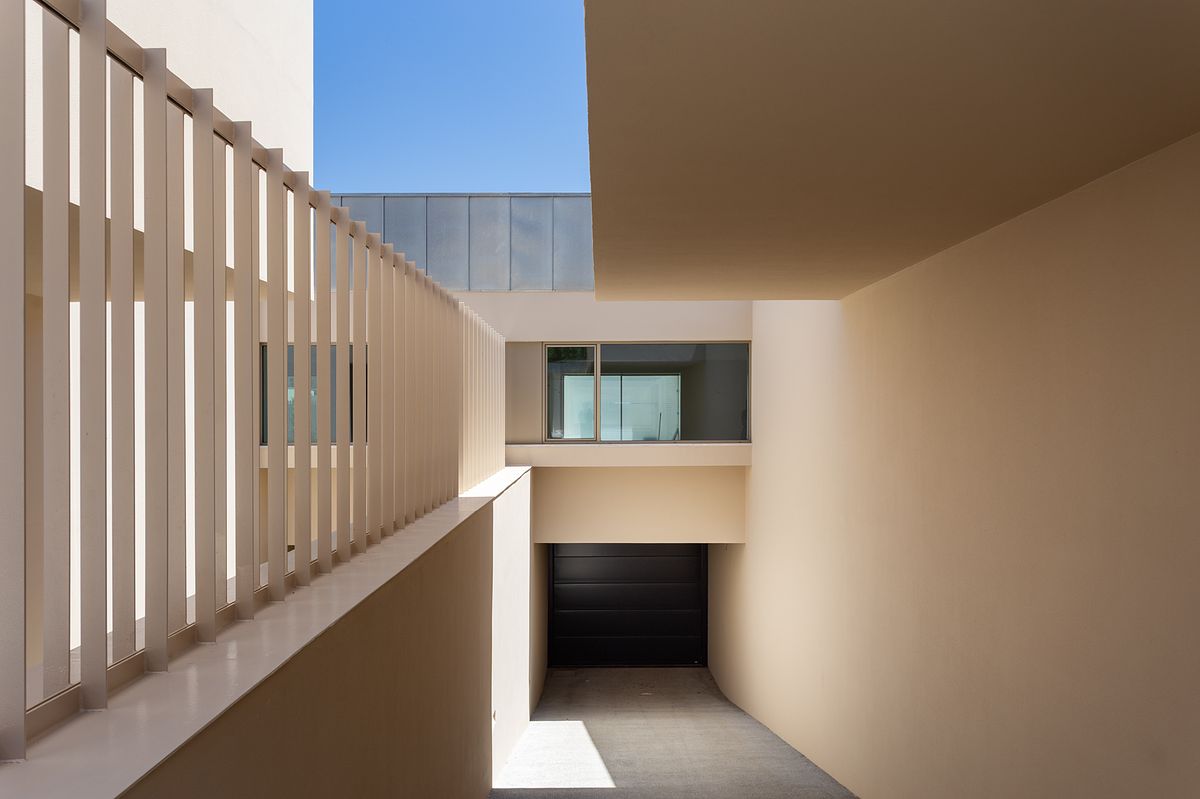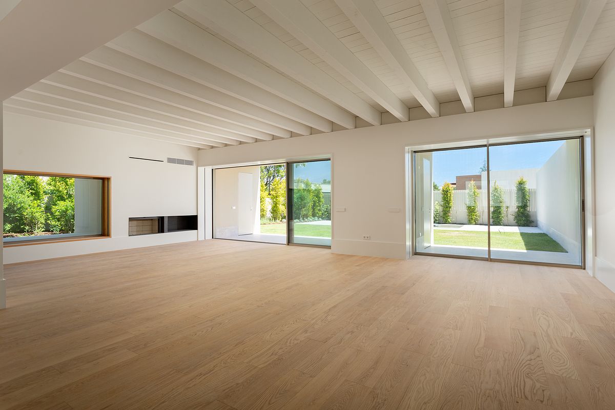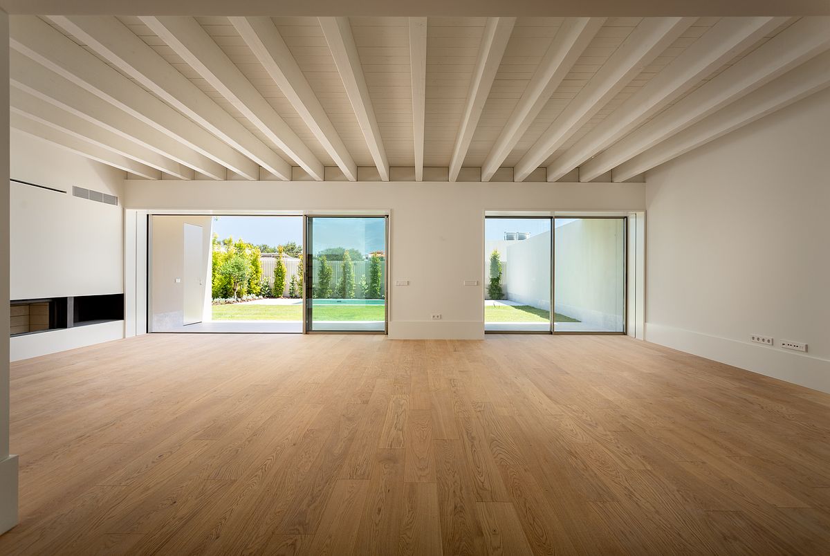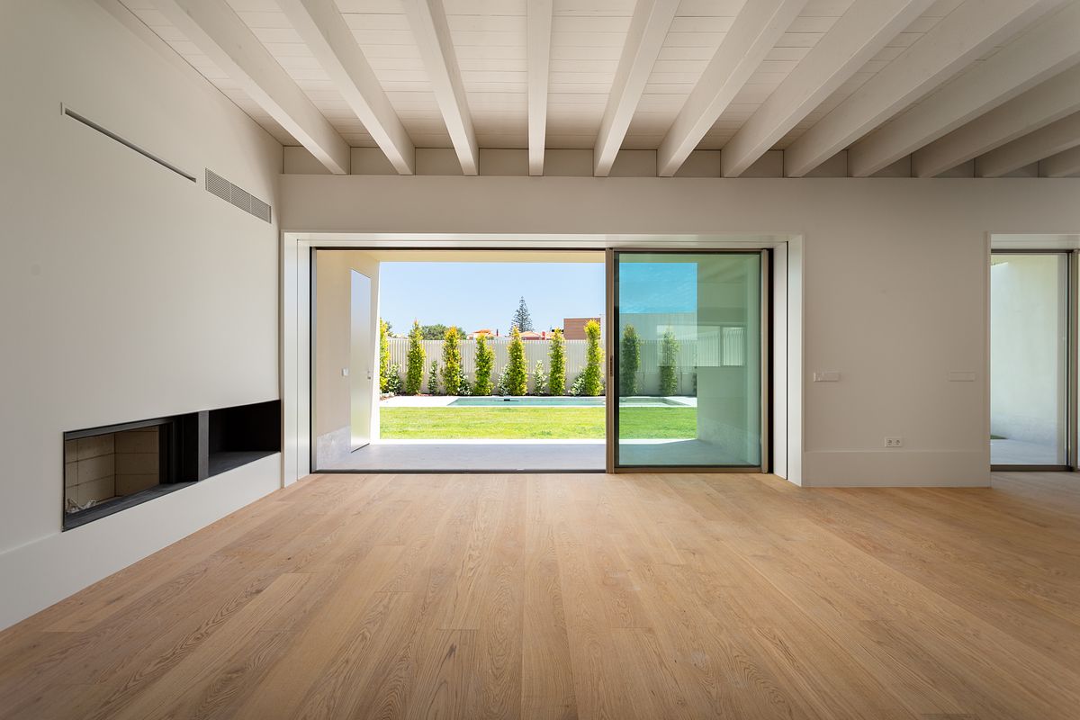 Os espaços interiores são generosos, com vãos envidraçados que promovem a entrada de luz natural e uma continuidade visual com o exterior, criando uma vivência luminosa e harmoniosa.