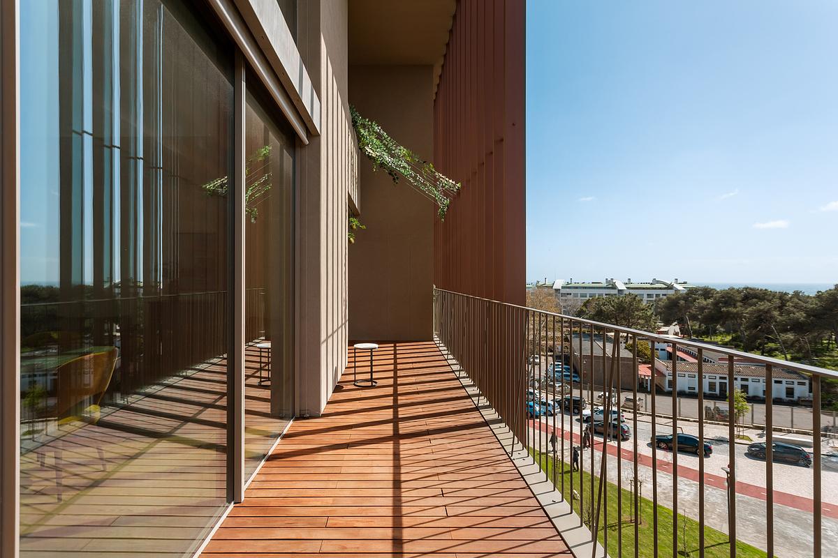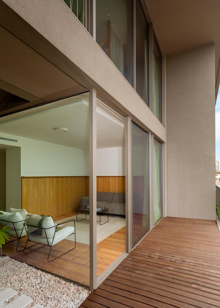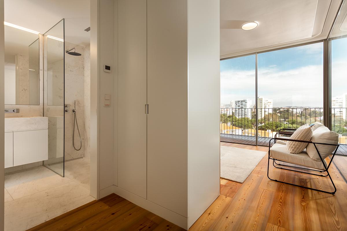 As áreas exteriores, incluindo varandas e vistas abertas sobre Cascais e o oceano, assumem um papel central na experiência do espaço, reforçando a ligação entre interior e exterior e contribuindo para um estilo de vida premium.